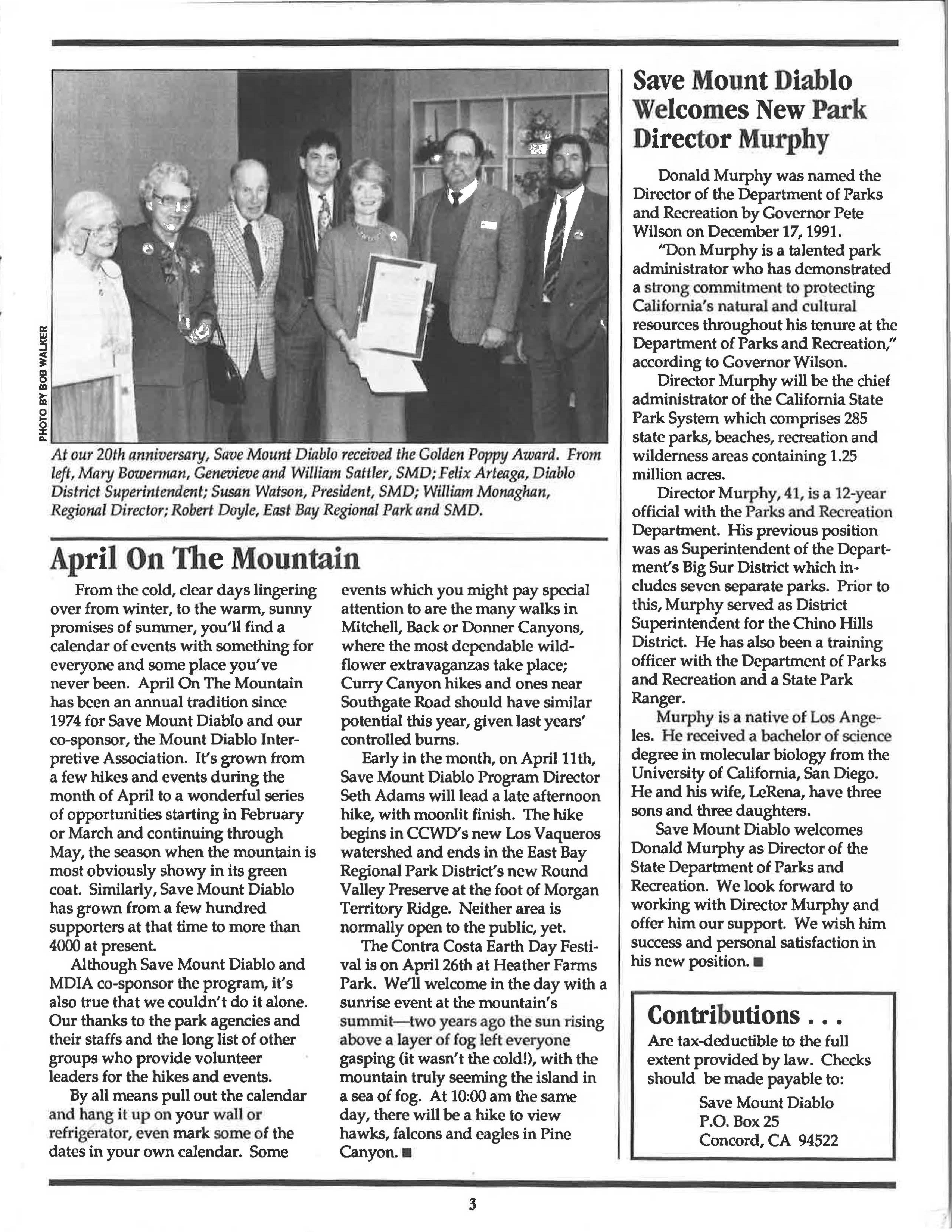 It is tempting to bask in the sunshine of another spring on Mount Diablo and in the warmth that comes from memories of our successful Twentieth Anniversary party and the honor of winning the Take Pride in California award.