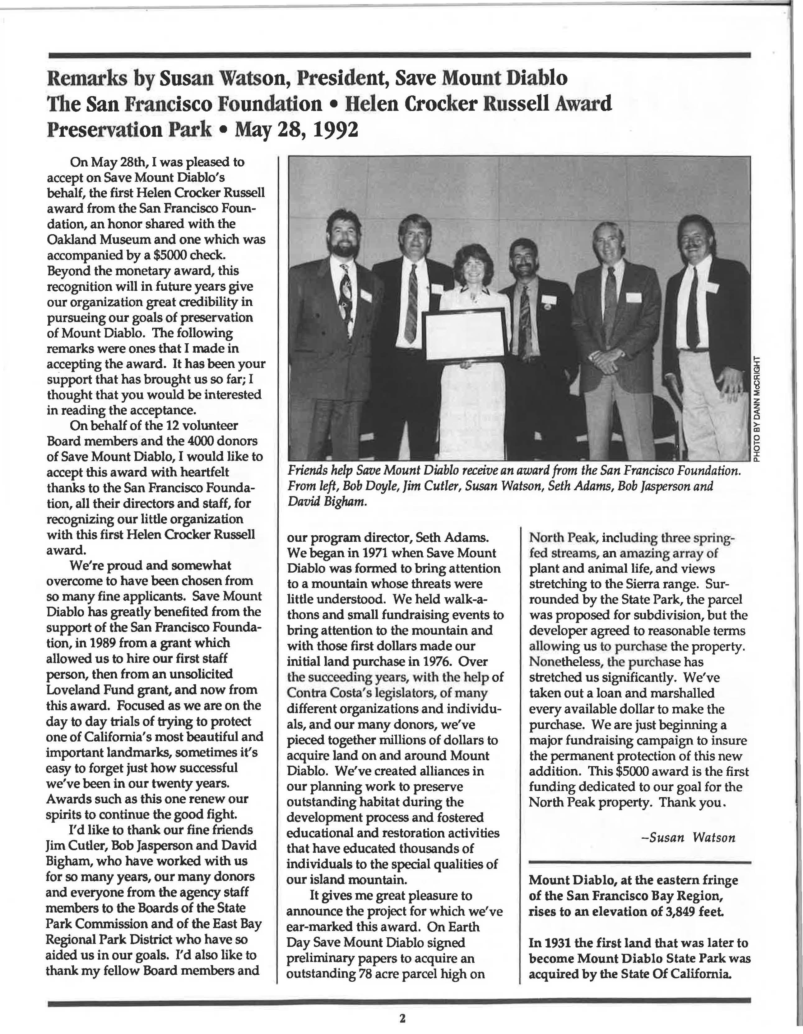 On May 28th Save Mount Diablo kicked off fundraising for the parcel when we received the first Helen Crocker Russell award (see 'President's message') from the San Francisco Foundation, 'for improving the quality of life in Alameda and Contra Costa counties'. The award included a $5000 grant. "We're grateful for the San Francisco Foundation's recognition of the importance of our work with this award, and we are dedicating the grant to the acquisition campaign for the 'Three Springs' parcel", said Watson. Save Mount Diablo members can see "Three Springs" during a series of hikes later this summer and fall (see 'Hikes and Events'). For more information write to SAVE MOUNT DIABLO, P. 0. Box 25, Concord, CA 94522 or call us (510) 229-4275.