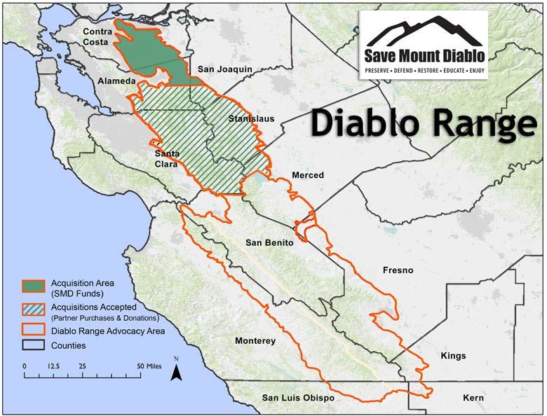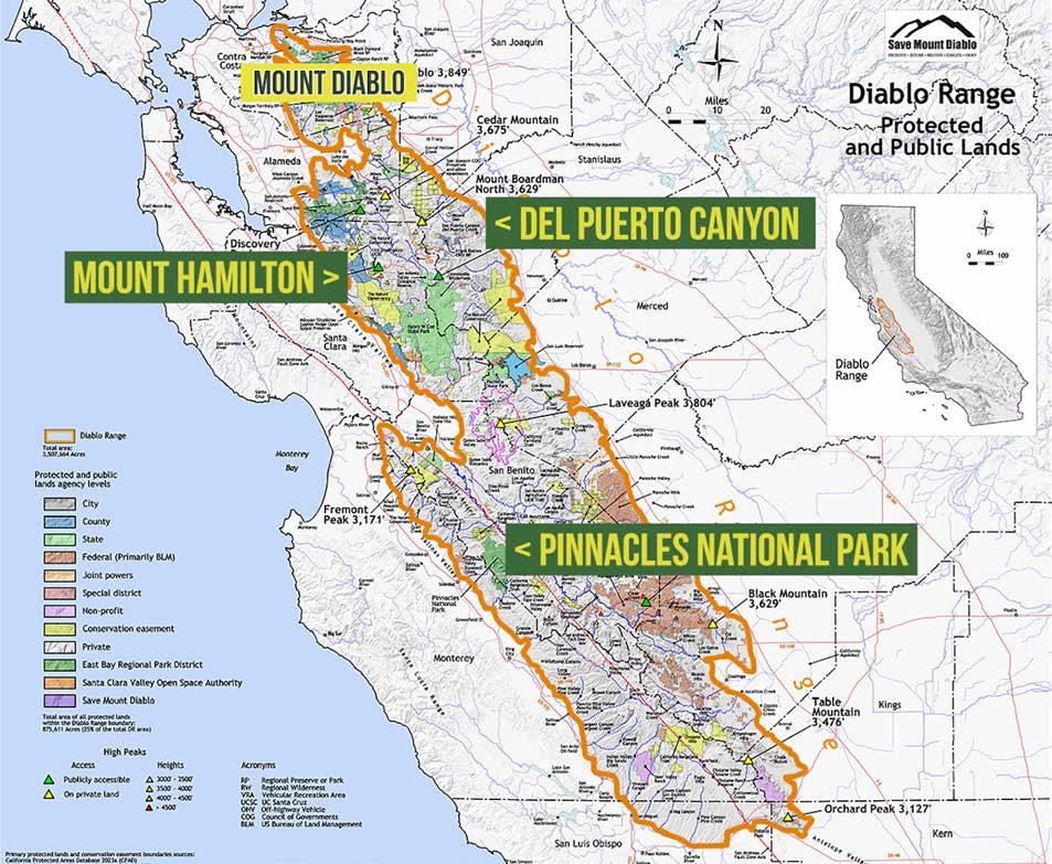 The Diablo Range is an incredible natural system and wildlife habitat corridor that is about 200 miles long, with Mount Diablo as the northern head of this important body that contains over 3.5 million acres, of which only about 25 percent is protected. It is filled with biodiversity and large privately owned ranches and other open spaces.