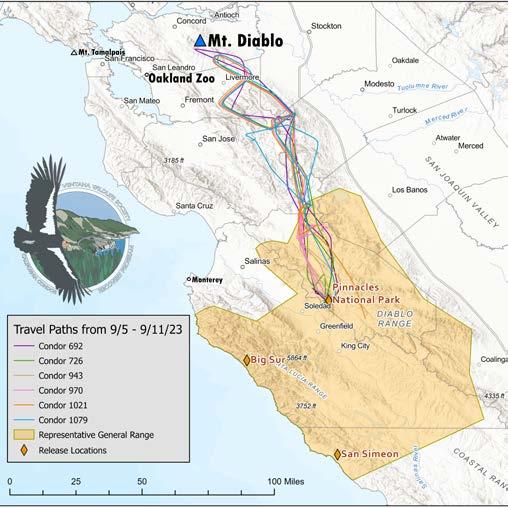 To give you a sense of how biologically rich the Diablo Range is, consider the following. In September of last year, six California condors were tracked by GPS transmitters, paid for in part by our Mary Bowerman Science and Research Program, flying in the Mount Diablo area. It was the first confirmed visit by a condor flock in our area in over 100 years. As the California condor population rebounds from near extinction in the 1980s, condors are reestablishing themselves in their largely intact Diablo Range. The Diablo Range also has the highest concentration of nesting golden eagles on the planet.