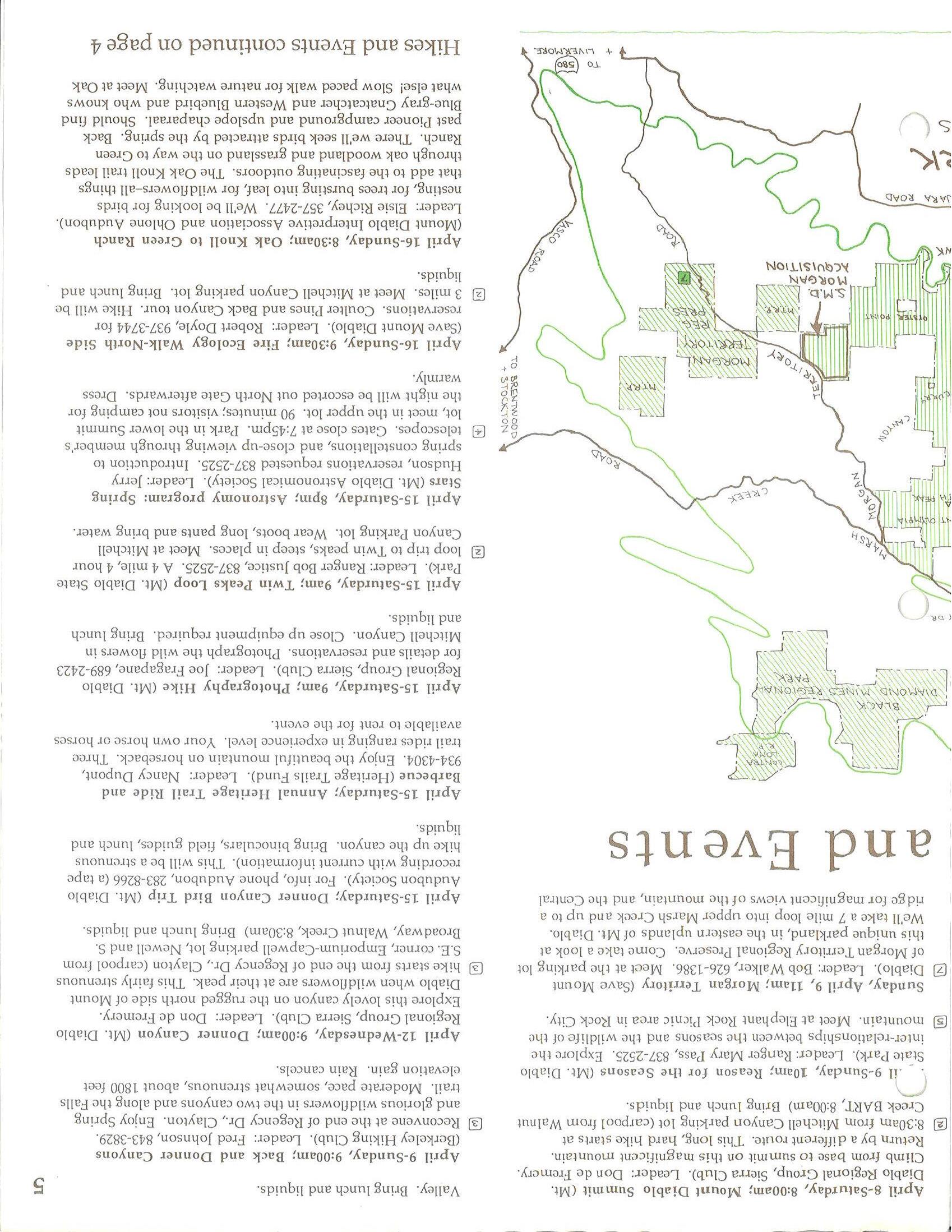 Inside you'll find a small map of Mount Diablo with events shown around it, continued on page 4. Numbers on the map refer to the starting points for the hikes. At the end of the month, we'll be celebrating the addition of our latest acquisition to the State Park. If you're already on our mailing list, or if you donated to the Morgan campaign this year, you'll receive an invitation later this month. Reserve the evening of April 29th on your calendar. We'll see you on the mountain.