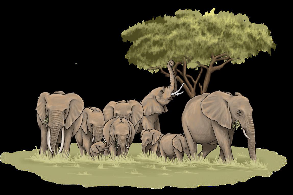 La cellule familiale de base d’un troupeau d’éléphants se compose d’une matriarche et de toutes ses parentes féminines (sœurs, tantes et cousines) et de leur progéniture dépendante, soit un total de 6 à 20 membres.