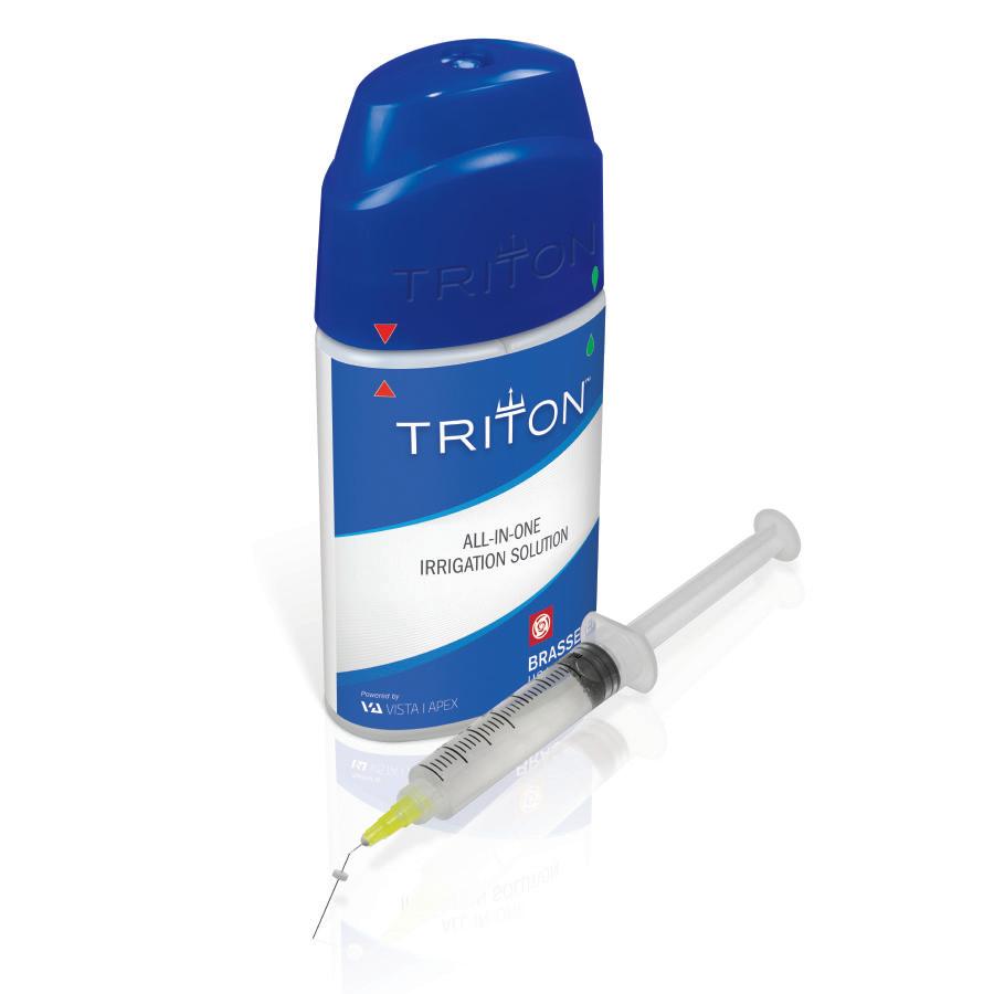 Despite the introduction of several unique devices to aid in endodontic irrigation, you may still need to use high volumes of multiple solutions, requiring additional steps, irrigants, tips, and needles. But now there is a solution with Triton—the first irrigant to deliver all the benefits of NaOCl, EDTA, and CHX in a singlestep, all-in-one irrigation solution. Triton’s proprietary blend of surfactants and gentle chelating agents work to proactively dissolve dentinal debris, exposing Triton’s lower concentration of NaOCl to organic debris without as much buffering. This synergistic and simultaneous dissolution of organic and inorganic debris allows you to avoid EDTA and CHX altogether. Connect with your Brasseler representative to switch to Triton today!