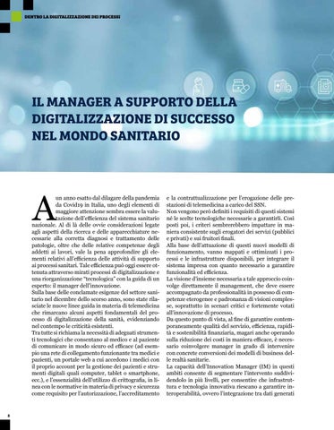 e la contrattualizzazione per l’erogazione delle prestazioni di telemedicina a carico del SSN. Non vengono però definiti i requisiti di questi sistemi né le scelte tecnologiche necessarie a garantirli. Così posti poi, i criteri sembrerebbero impattare in maniera consistente sugli erogatori dei servizi (pubblici e privati) e sui fruitori finali. Alla base dell’attuazione di questi nuovi modelli di funzionamento, vanno mappati e ottimizzati i processi e le infrastrutture disponibili, per integrare il sistema impresa con quanto necessario a garantire funzionalità ed efficienza. La visione d’insieme necessaria a tale approccio coinvolge direttamente il management, che deve essere accompagnato da professionalità in possesso di competenze eterogenee e padronanza di visioni complesse, soprattutto in scenari critici e fortemente votati all’innovazione di processo. Da questo punto di vista, al fine di garantire contemporaneamente qualità del servizio, efficienza, rapidità e sostenibilità finanziaria, magari anche operando sulla riduzione dei costi in maniera efficace, è necessario coinvolgere manager in grado di intervenire con concrete conversioni dei modelli di business delle realtà sanitarie. La capacità dell’Innovation Manager (IM) in questi ambiti consente di segmentare l’intervento suddividendolo in più livelli, per consentire che infrastruttura e tecnologia innovativa riescano a garantire interoperabilità, ovvero l’integrazione tra dati generati