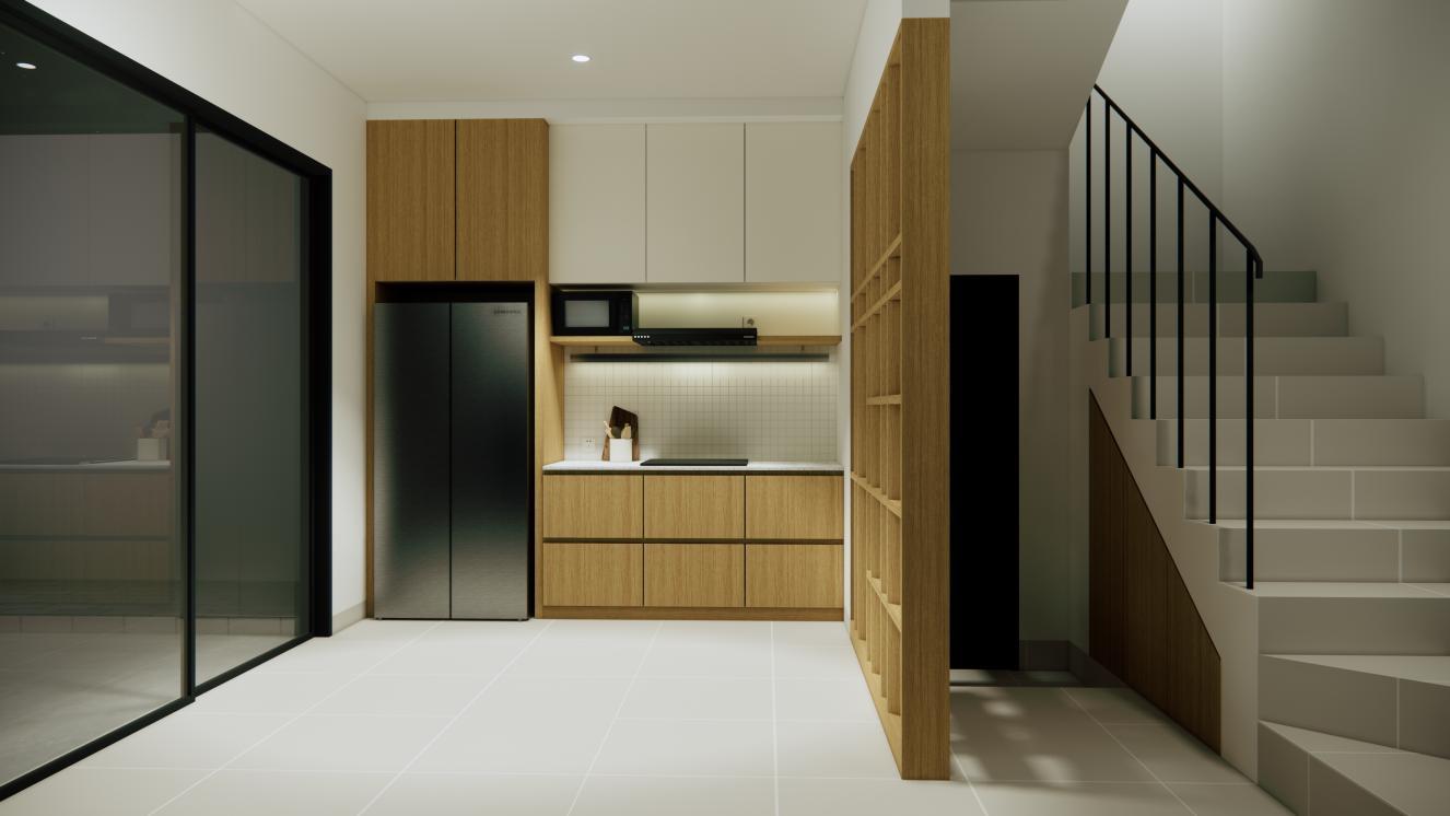Desain furniture built-in memaksimalkan ruang yang ada, terlihat dari desain cabinet yang dibuat full- height pada area kamar tidur dan dapur sehingga dapat menjadi tempat penyimpanan .