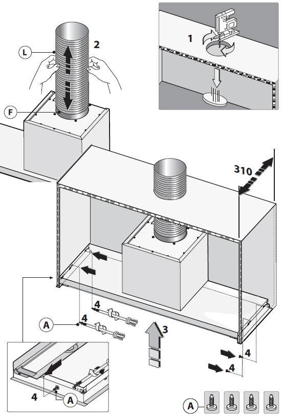 Asenna aktiivihiilisuodattimet (2 kpl) poistamalla ensin liesikuvun rasvasuodattimet (2 kpl) (kuva 3) ja kiertämällä aktiivihiilisuodattimet moottorin kumpaankin poskeen.