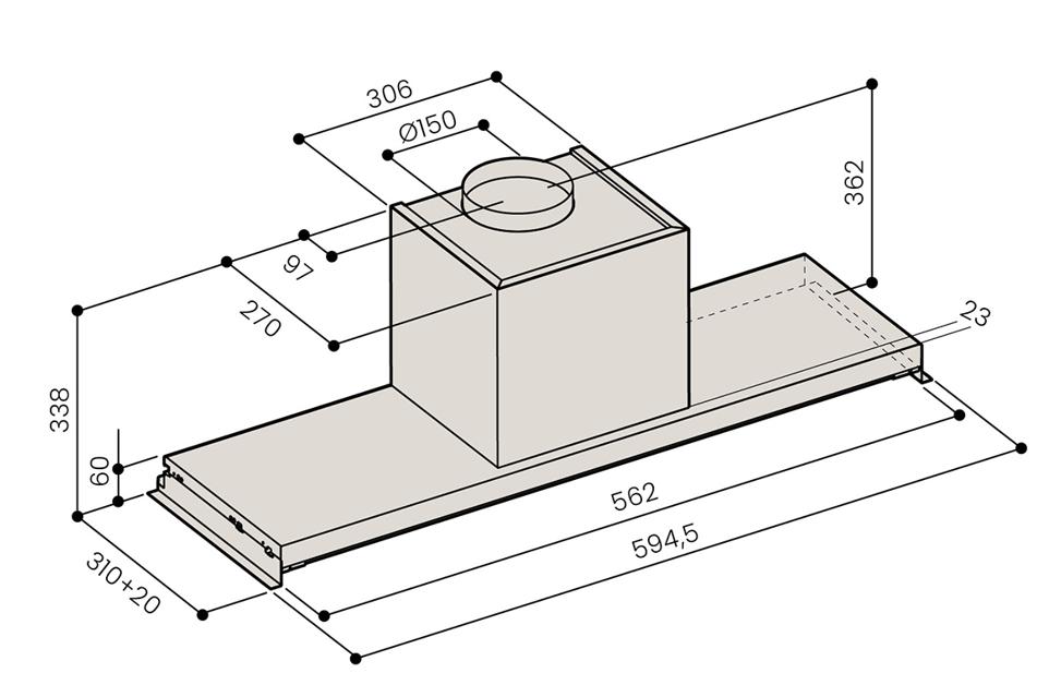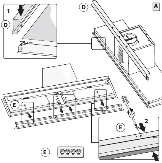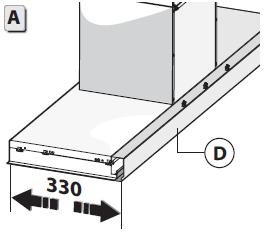 Takapeitelevy (D) estää ruokakäryjen karkaamisen liesituulettimen taakse. Liesituulettimen mukana tulee vakiona 20 mm syvä takapeitelevy. Tarvikeosina saatavilla myös 10 mm ja 30 mm versiot.