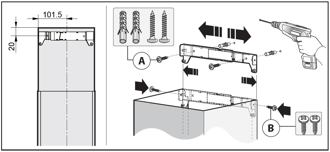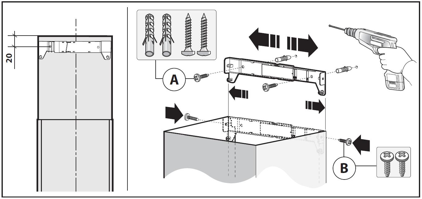 • Poraa seinään reiät ja kiinnitä liesituuletin. Tarkista että liesituuletin on vaakatasossa ja että liesituulettimen mukana toimitetut ruuvit ja ankkurit sopivat seinämateriaalille.