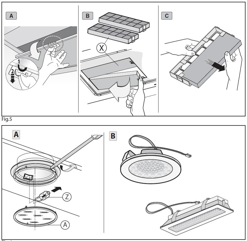 Irrota rasvasuodatin. Vedä hiilisuodatin irti kehikostaan ja asenna uusi paikalleen. Puhdista samalla rasvasuodatin. Aktiivihiilisuodatinmalli LL-45 (Long Life).