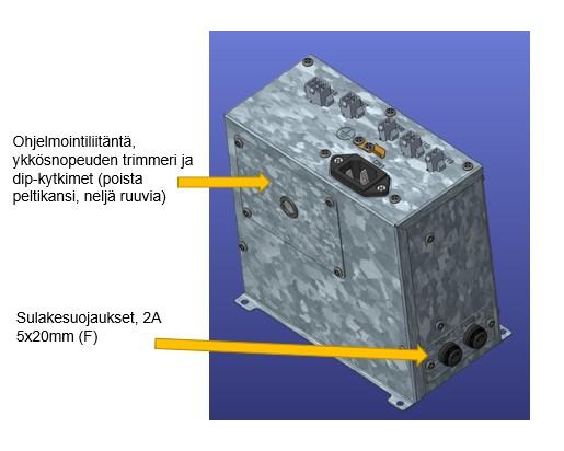 Kaikki liitännät, lukuun ottamatta ohjelmointiliitäntää, tapahtuu elektroniikkakotelon ulkoliittimissä.