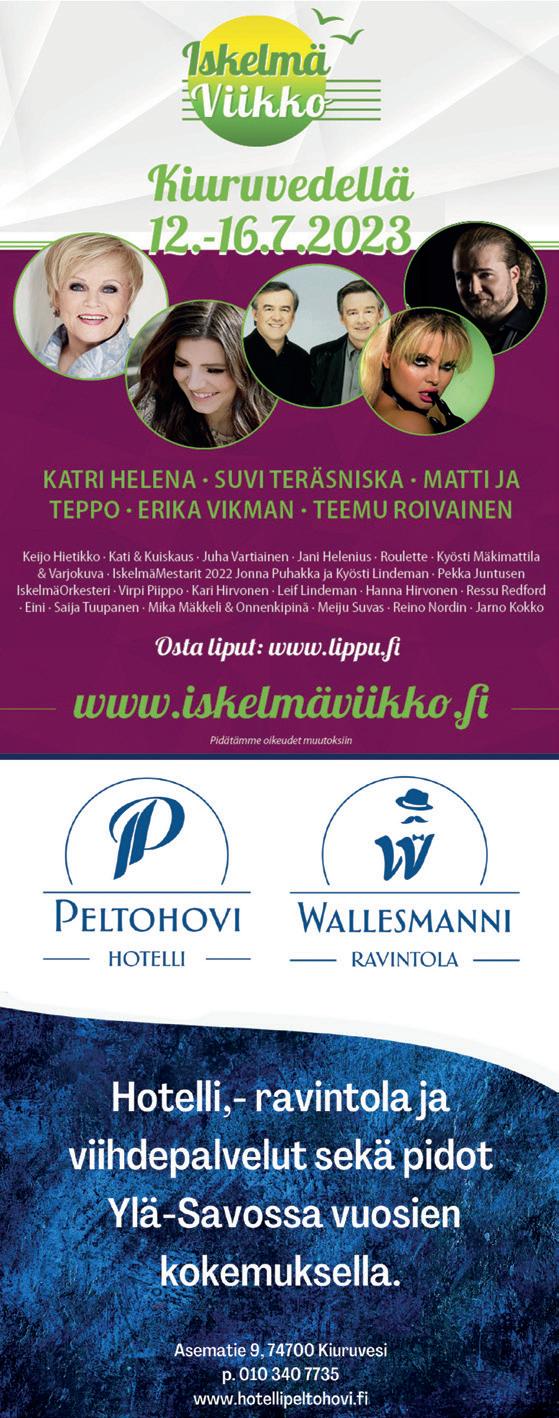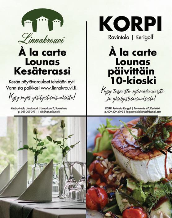 5 Savon seutu Matkailuopas 4 Hurmaavaa kesälomaa Savossa 6 Ajankohtaista 8 Kuopion museo: Wildlife Photographer of the Year -näyttely 10 Kesän helpoin perheloma Savonlinnassa 11 Puumalasta Saimaan alueen ensimmäinen kestävän matkailun destinaatio 12 Pehtoorin paras kesä ikinä! 13 Kesäteatteriesityksiä 14 Tapahtumavinkkejä, musiikki 15 Tapahtumavinkkejä, Urheilu ja liikunta 16 Perinteisiä kesätapahtumia, lapsiperheiden ohjelmaa, ruokatapahtumia 17 Kuopio musiikkitapahtumat 18 Mikkelin XXXII Musiikkijuhlat 20 Mitä ihmettä? 22 Tapahtumat 24 Savolainen ruokakulttuuri 25 Makumatkalla Savossa 26 Retkeilemään kansallispuistoon 27 Etelä-Konneveden kansallispuisto 28 Koloveden kansallispuisto 29 Repoveden kansallispuisto ja Linnansaaren kansallispuisto 30 Eläinpuistoja 32 Pohjois-Savon kesä 34 Tahkon matkailualue 35 Kulturelli Kuopio 44 Mansikkaniemessä maalaiskomediaa 46 Eukonkannon MM-kisat 47 Kylien yhteiset tilat -hanke 49 Musiikki soi Rautalammin kesässä 50 Sonkajärvi, Volokinpolku 55 Valkeisten vanha