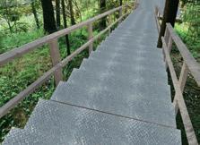 Portaat on rakennettu teräsritilästä, jotka eivät ole märkänäkään liukkaat. Koirat on huomioitu toteuttamalla portaiden toiseen laitaan vanerinen koirakaista.
