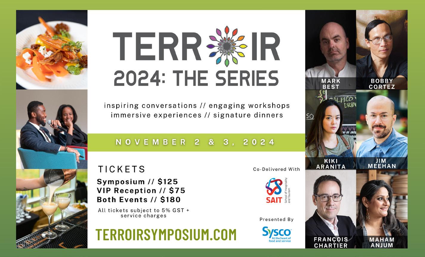 Part two of Terroir Symposium runs Nov. 3-4, 2024 and features a starstudded lineup of international culinary and hospitality experts. Attendees can expect engaging workshops, insightful panel discussions and exclusive culinary experiences. Delve deeper into the world of food and beverage, while learning about sustainability, innovation and regional flavours. Terroir Symposium at SAIT | terroirsymposium