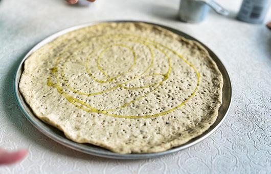 For immediate use after initial rise, or after second rise of refrigerated dough, place each pizza ball on a floured or semolina-topped board. Flatten dough slightly, press a rim around the outer edge with your fingers, and then dimple the dough all over with your fingers to press out large air bubbles. Moving the dough in a circle, gently stretch out to make a 30-cm (12") circle, and place on a greased pizza pan or stone. Dock the surface of the crust all over with a docker or tines of a fork. Drizzle the crust with olive oil and spread over the surface with your fingers. Let rise for about 15 minutes, preheating the oven to 230 C (450 F) while the dough is rising.