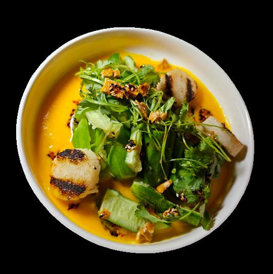 The Smashed Cucumber is a revelation in freshness. It’s cool, crisp ribbons of cucumber meet the char of grilled rice, complemented by a carrot-miso dressing. Scattered herbs and shards of peanut brittle bring the crunch.