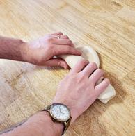 Take the dough out and put it on your counter. With two cupped hands on each side of the dough, move the mound of dough around in a circle until it forms a ball. Press a finger into the dough. It should be smooth in appearance and springy, like a Pilates ball. If it’s not, knead it by hand until it is.