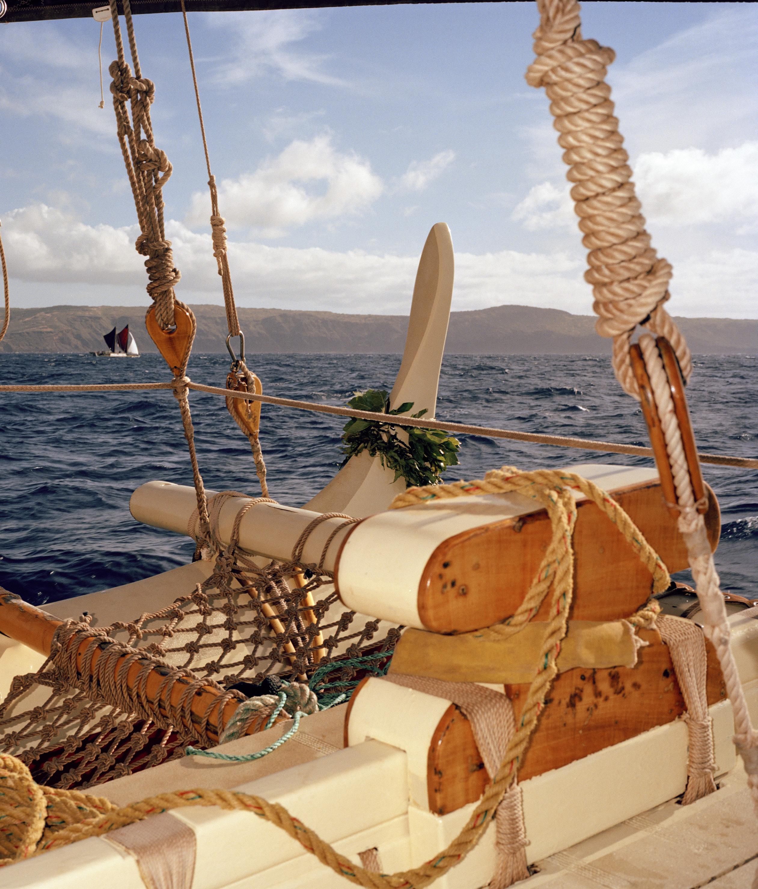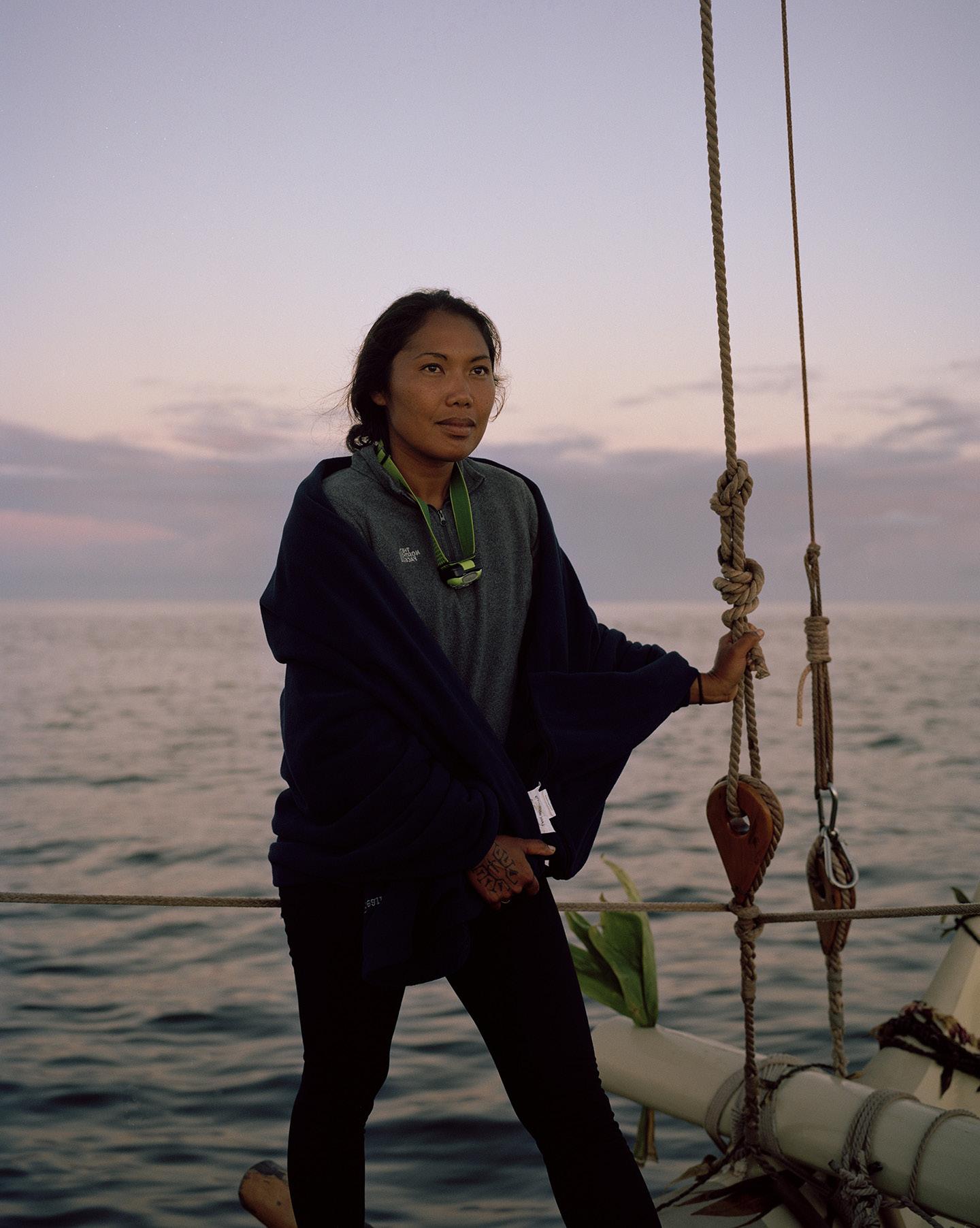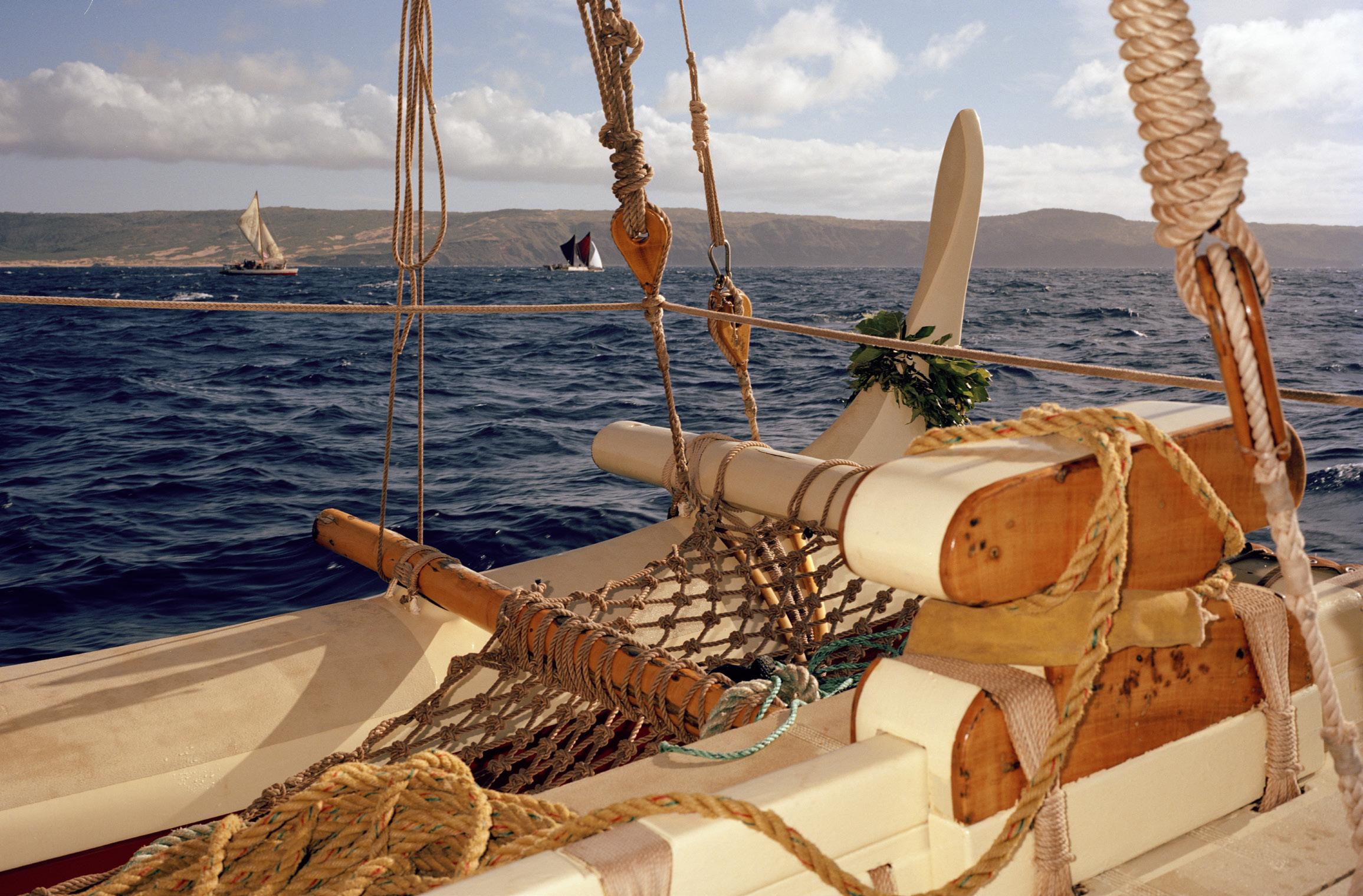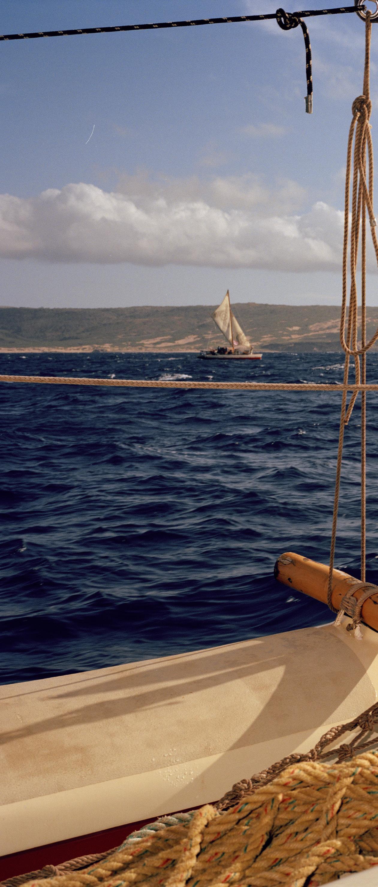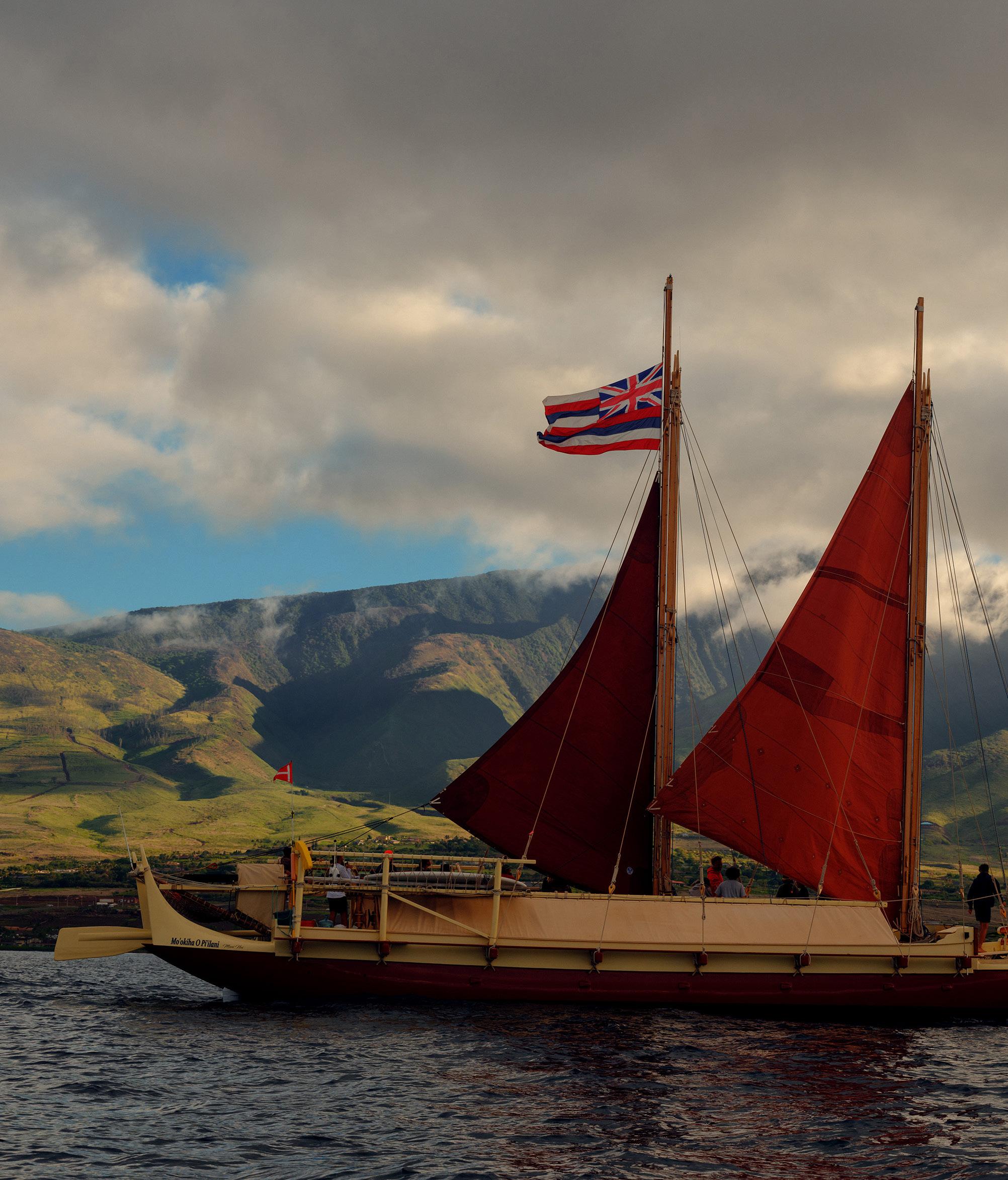 The Mo‘olele sailing off Maui; (opposite) Kalā Babayan, the navigator.