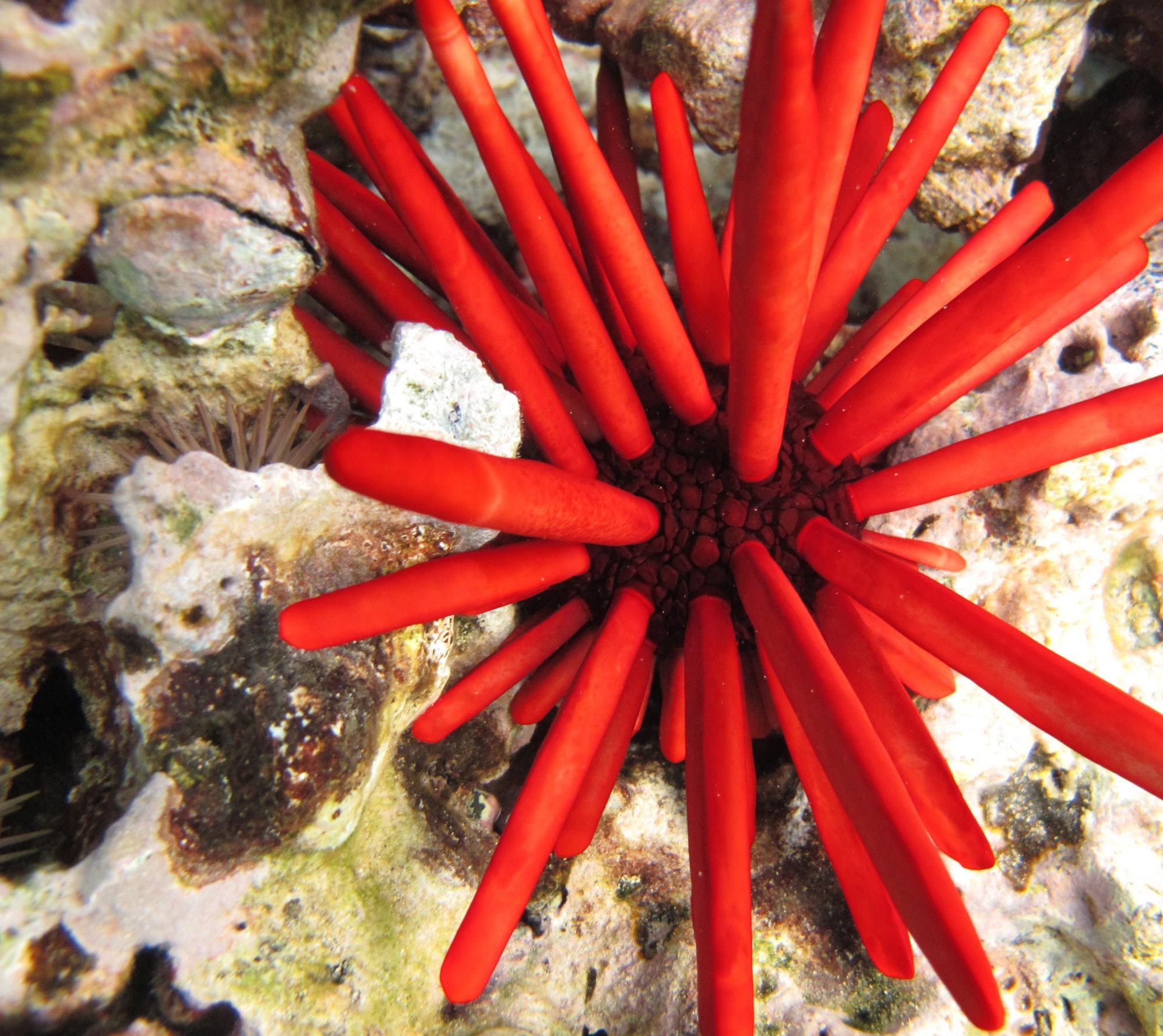 Hawai‘i’s waters are known for their colorful fish, exotic coral and even large mammals. One of the more visually striking creatures is the red pencil urchin, also known as ‘ina ‘ula in Hawaiian, with long, solid bright red spines protruding out of its round body. Looking almost like a pincushion for crayons, these peaceful pointy creatures typically reside in the crevices of offshore reefs, emerging at night to feed on a diet of mostly algae. Though these urchins aren’t poisonous, do not touch them as you can cause serious damage to the creature. It’s hard to resist the appeal of such an intriguing, vibrant marine animal, but snorkelers and scuba divers are asked to admire with their eyes, not with their hands.