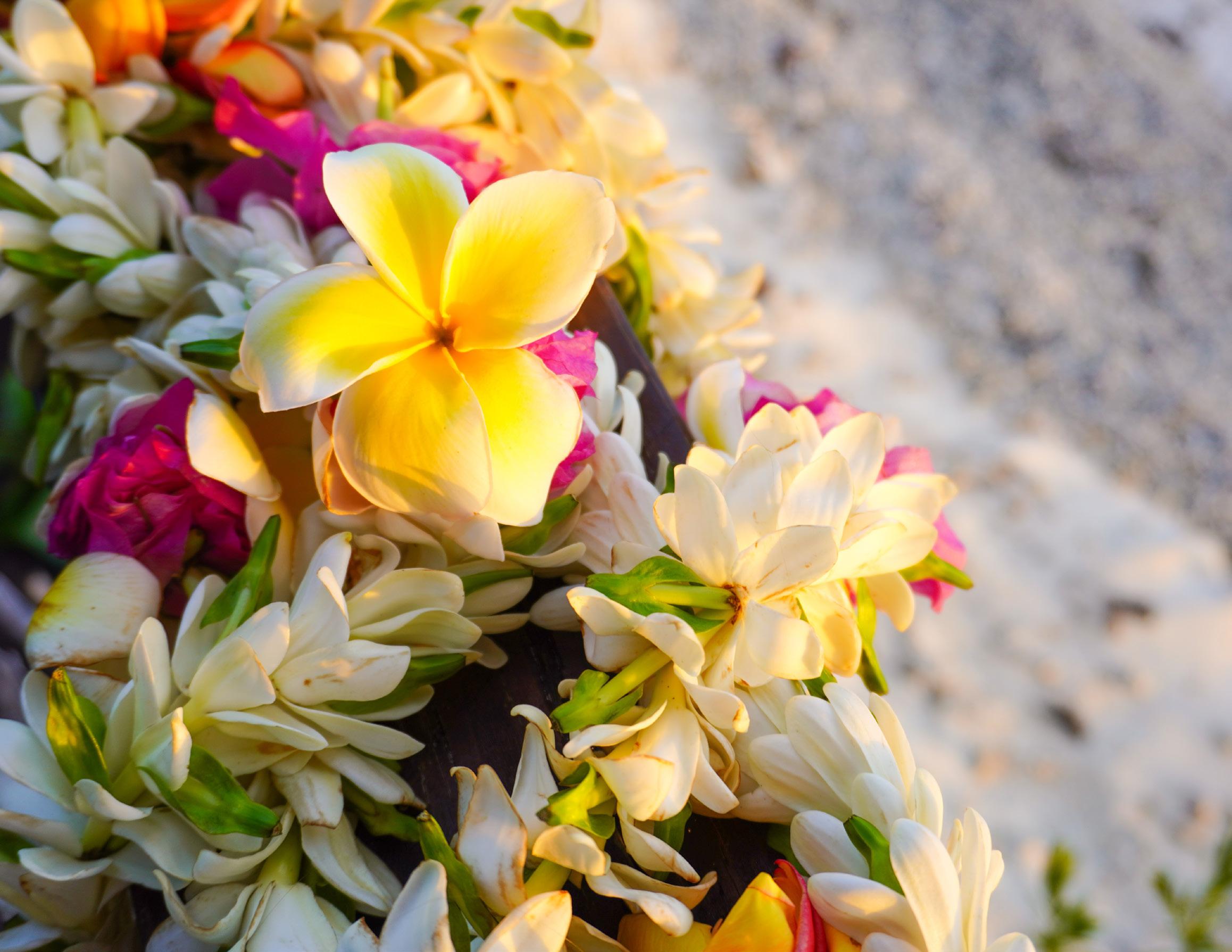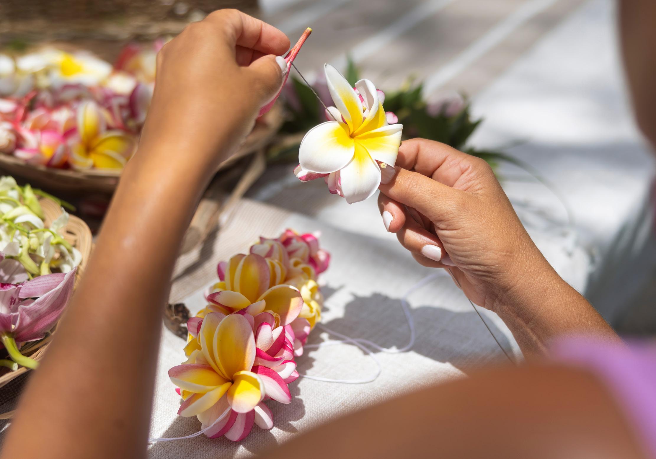 Plumeria, or melia, is a popular flower for lei for its sweet fragrance, beauty, color variation and abundance. White plumeria are most often seen though they can be pink or red and include yellow and orange hues. Also called frangipani, they are a favorite in perfumes and bathing products. With their elliptical, pointy petals, they are as beautiful as they are pungent with velvety texture that makes them feel sensuous to the touch. It takes approximately 50 blossoms for a single, 40-inch lei. The plumeria lei will last for one day. To maintain the freshness of the lei, sprinkle water lightly, wrap in a damp paper towel and keep cool.