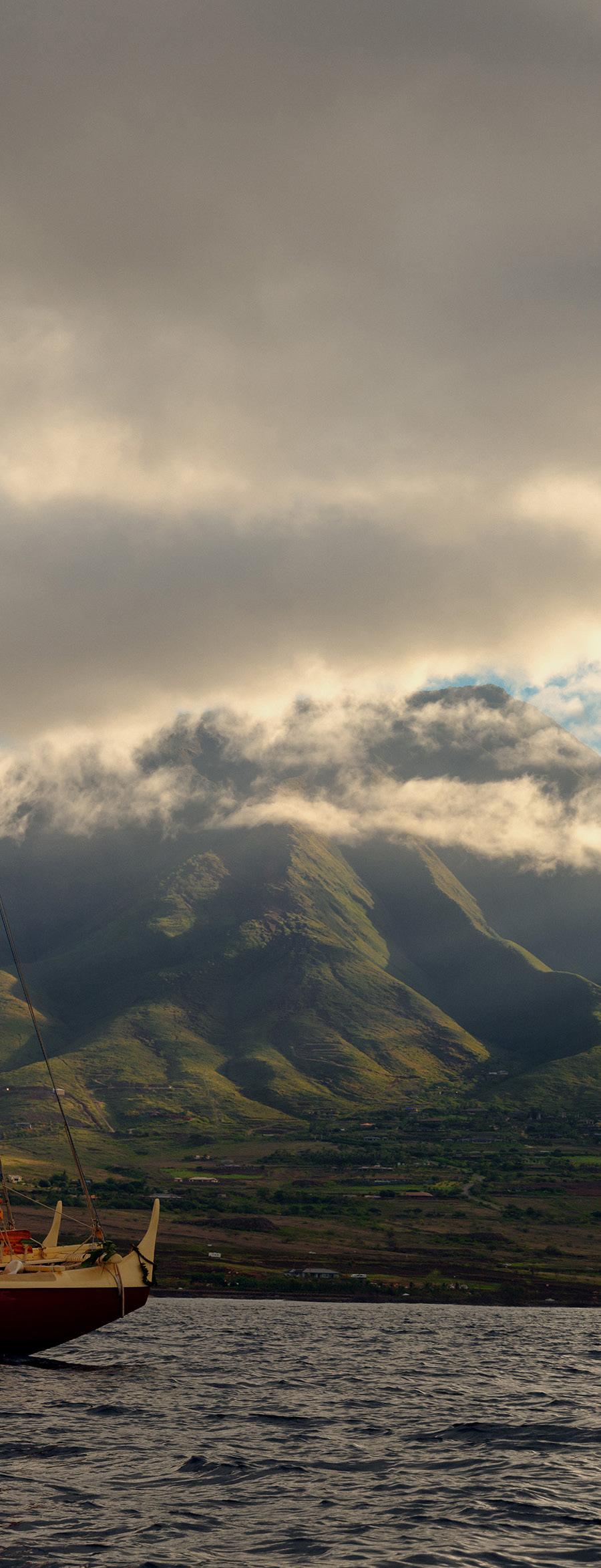 Agentle rain fell as Mo‘okiha O Pi‘ilani slowly rolled up Front Street to Māla Wharf before sunrise on the morning of July 7, 2014. Four days later, the nearly 63-foot, 12-ton, wa‘a kaulua (doublehulled traditional sailing canoe) was launched into the ocean off the shores of Lāhainā at high tide. Crew of the Mo‘okiha, paddlers from 40 Maui canoe and paddling clubs, and Hawaiian practitioners from across the island gathered on the historic pier and in the water for a traditional Hawaiian canoe launching ceremony.