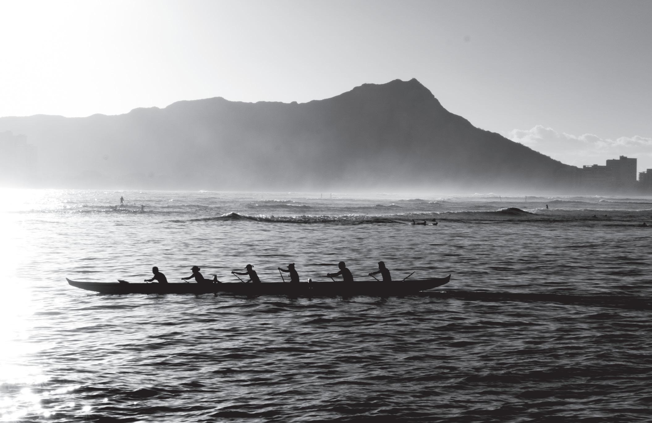 Compared to other types of canoes, outrigger canoes are quite fast and are capable of being paddled with a single-sided blade or sailed in rough water. Today, the traditional Hawaiian sport of outrigger canoe racing has spread throughout the world with competitions hosted in countries with and without a history of outrigger canoe voyaging, as well as various locations across the U.S. mainland. In fact, outrigger canoe racing is the official state team sport of Hawai‘i and an interscholastic high school sport. A variety of outrigger canoe types exist; however, it’s typically the OC1, OC2, OC3, OC4 and OC6 (with the respective number of paddlers using a single-hull outrigger canoe) made of high-tech, lightweight materials that are used in competitions today. Major races in Hawai‘i are held annually each fall and include the Moloka‘i Hoe men’s race from the island of Moloka‘i to O‘ahu across the notoriously rough Ka‘iwi Channel, Na Wahine O Ke Kai (the same race for women) and the Queen Lili‘uokalani Race held in Kona.