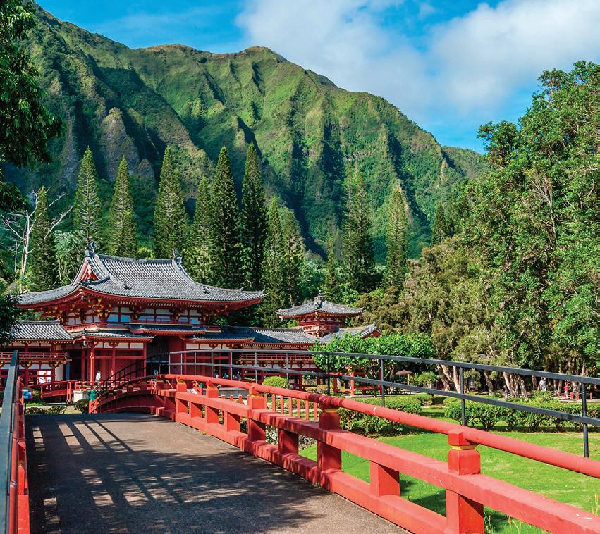 In ‘Āhuimanu you will pass the Valley of the Temples Memorial Park, just off Kahekili Highway. At the back of the valley, you will find Byodo-In Temple, a nonpracticing Buddhist temple that welcomes guests to walk the tranquil grounds and feed the many koi