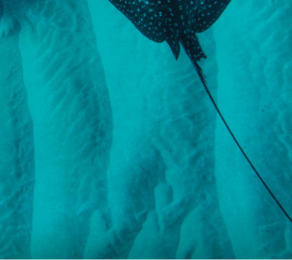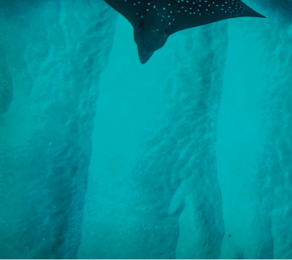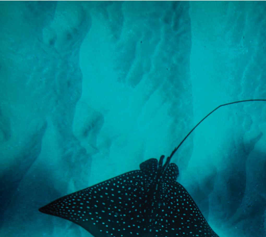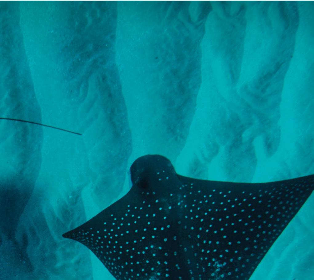 Hawai‘i is home to some of the most magnificent creatures on Earth. The spotted eagle ray is known as hīhīmanu in Hawaiian, which means “magnificent” or “elegant.” And if you are lucky enough to spot one while snorkeling, you will see that the ray truly lives up to its name. This graceful, beautiful ray glides through Hawai‘i’s coastal areas, feeding on clams, urchins and other sea creatures in the sand. The tops of their dark gray bodies are covered with white spots, while underneath, they are completely white. They have a long tail with sharp spines at the base, and their “wings,” or dorsal fins, can span up to six feet from end to end.