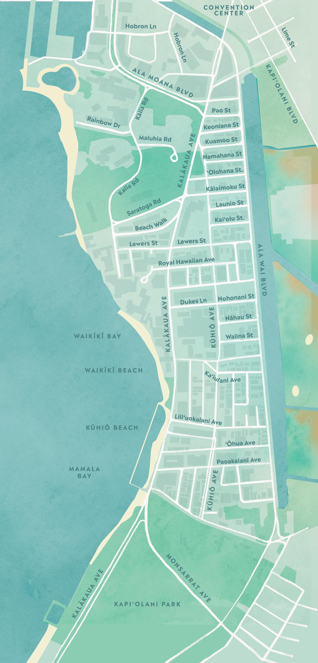 Kapahulu Avenue will lead you to Waikīkī, the hub of island tourism. The area is known for its two-mile stretch of beaches, numerous shopping centers, array of restaurants and shows, all within walking distance.