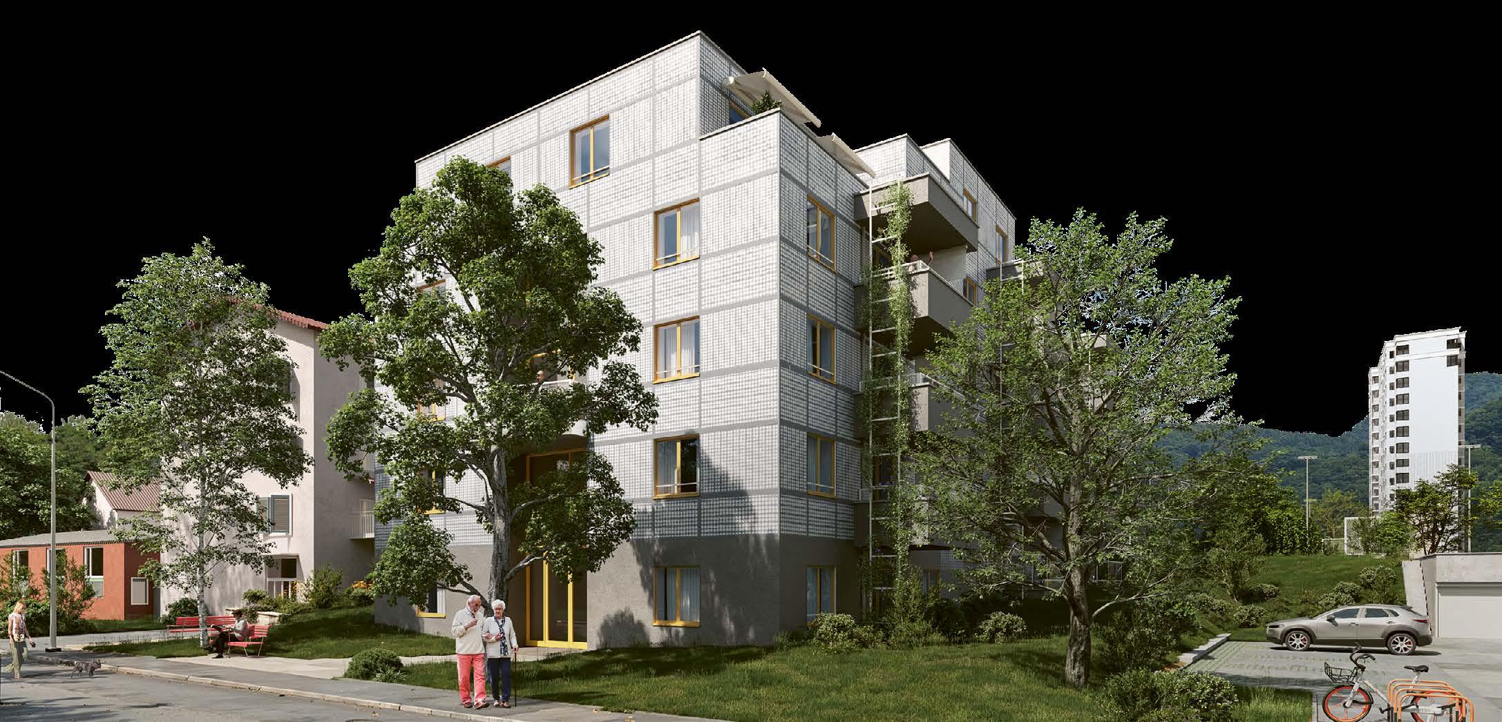 Neubau ersetzt das Gebäude von 1961. Anstatt der früheren 23 Wohnungen werden nun deren 28 bezogen. Dazu kommt eine bauliche Besonderheit, die zu einer guten Nachbarschaft beiträgt: Eine «rue intérieure» verbindet die Wohnungen auf jedem der vier Geschosse. Als «rue intérieure», zu Deutsch eine «innere Strasse», bezeichnen die Architekt*innen einen Aufenthaltsraum zwischen Wohnungen und Treppenhaus.
