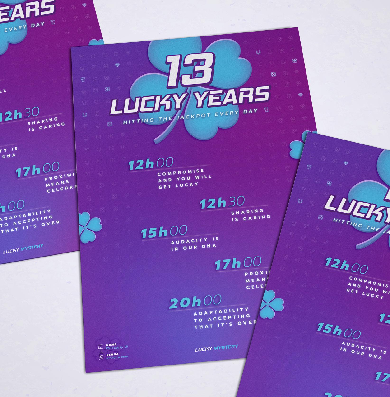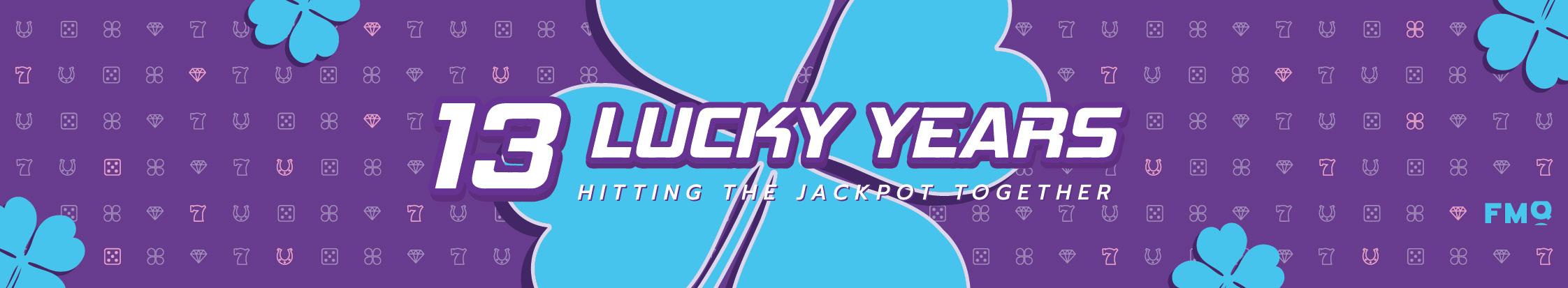 Development of a versatile graphic identity for FABAMAQ’s 13th anniversary celebration, representing the essence of the company as a software house specializing in casino game development, while integrating the theme of luck and fortune associated with the number 13 (thirteen).