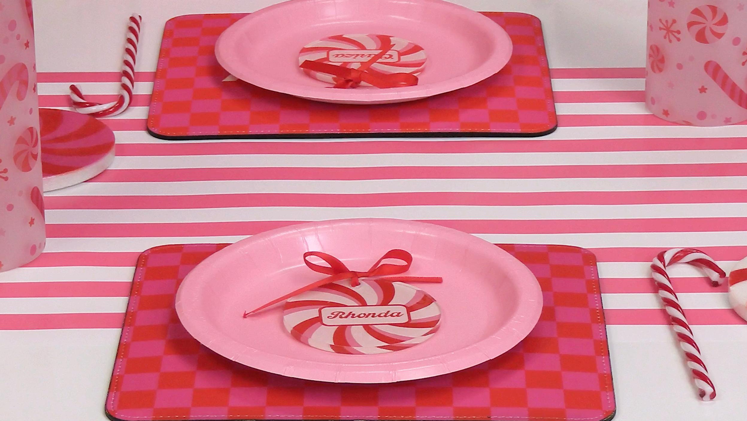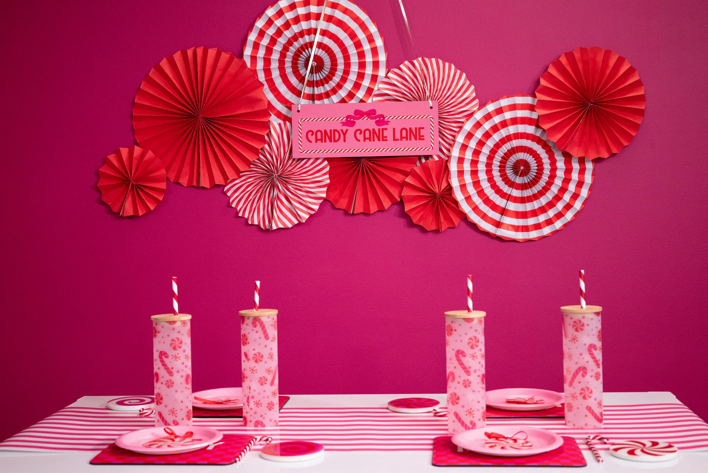 This playful holiday collection brings a fresh twist to the traditional holiday palette by adding vibrant pops of pink and eye-catching geometric patterns. "Candy