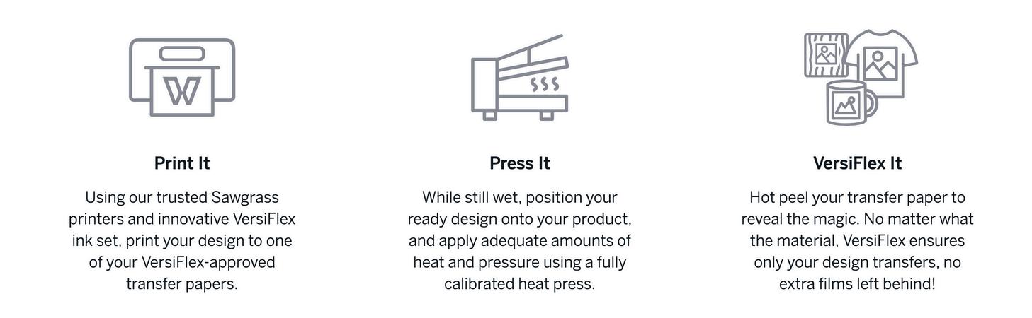 Gli inchiostri VersiFlex sono realizzati appositamente per il sistema brevettato Sawgrass VersiFlex e garantiscono risultati di alta qualità con la nostra carta transfer leggera VersiFlex,TruePix e Sublimation HTV.