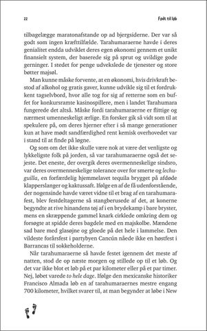 tilbagelægge maratonafstande op ad bjergsiderne. Der var så godt som ingen kræfttilfælde. Tarahumaraerne havde i deres genialitet endda udviklet deres egen økonomi gennem et unikt finansielt system, der baserede sig på sprut og uvildige gode gerninger. I stedet for penge udvekslede de tjenester og store bøtter majsøl. Man kunne måske forvente, at en økonomi, hvis drivkraft bestod af alkohol og gratis gaver, kunne udvikle sig til et fordrukkent tagselvbord, hvor alle tog for sig af retterne som en buffet for konkursramte kasinospillere, men i landet Tarahumara fungerede det altså. Måske fordi tarahumaraerne er flittige og nærmest umenneskeligt ærlige. En forsker gik så vidt som til at spekulere på, om deres hjerner efter i så mange generationer kun at have mødt sandfærdighed rent kemisk overhovedet var i stand til at finde på løgne. Og som om det ikke skulle være nok at være det venligste og lykkeligste folk på jorden, så var tarahumaraerne også det sejeste. Det eneste, der overgik deres overmenneskelige sindsro, var deres overmenneskelige tolerance over for smerte og lechuguilla, en forfærdelig hjemmelavet tequila brygget på afdøde klapperslanger og kaktussaft. Ifølge en af de få udenforstående, der nogensinde havde været vidne til et brag af en tarahumarafest, blev festdeltagerne så stangberusede af det, at konerne begyndte at rive hinandens tøj af i en brydekamp i bare bryster, mens en skræppende gammel knark cirklede omkring dem og forsøgte at spidde deres bagdele med en majskolbe. Mændene sad bare med glasøjne og gloede på det hele i lammelse. Den vildeste forårsfest i partybyen Cancún nåede ikke en høstfest i Barrancas til sokkeholderne. Når tarahumaraerne så havde festet igennem det meste af natten, stod de op næste morgen og stillede op til et løb. Og det var ikke blot et løb på et par kilometer eller på et par timer. Nej, løbet varede to hele dage. Ifølge den mexicanske historiker Francisco Almada løb en af tarahumaraernes mestre engang 700 kilometer, hvilket svarer til, at man begynder at løbe i New