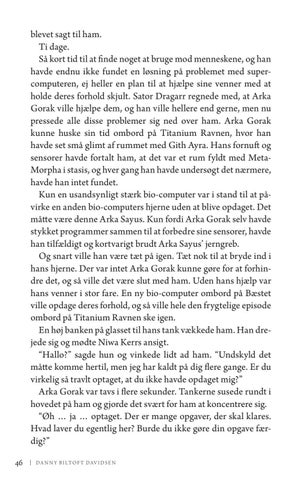 blevet sagt til ham. Ti dage. Så kort tid til at fi nde noget at bruge mod menneskene, og han havde endnu ikke fundet en løsning på problemet med supercomputeren, ej heller en plan til at hjælpe sine venner med at holde deres forhold skjult. Sator Dragarr regnede med, at Arka Gorak ville hjælpe dem, og han ville hellere end gerne, men nu pressede alle disse problemer sig ned over ham. Arka Gorak kunne huske sin tid ombord på Titanium Ravnen, hvor han havde set små glimt af rummet med Gith Ayra. Hans fornuft og sensorer havde fortalt ham, at det var et rum fyldt med MetaMorpha i stasis, og hver gang han havde undersøgt det nærmere, havde han intet fundet. Kun en usandsynligt stærk bio-computer var i stand til at påvirke en anden bio-computers hjerne uden at blive opdaget. Det måtte være denne Arka Sayus. Kun fordi Arka Gorak selv havde stykket programmer sammen til at forbedre sine sensorer, havde han tilfældigt og kortvarigt brudt Arka Sayus’ jerngreb. Og snart ville han være tæt på igen. Tæt nok til at bryde ind i hans hjerne. Der var intet Arka Gorak kunne gøre for at forhindre det, og så ville det være slut med ham. Uden hans hjælp var hans venner i stor fare. En ny bio-computer ombord på Bæstet ville opdage deres forhold, og så ville hele den frygtelige episode ombord på Titanium Ravnen ske igen. En høj banken på glasset til hans tank vækkede ham. Han drejede sig og mødte Niwa Kerrs ansigt. “Hallo?” sagde hun og vinkede lidt ad ham. “Undskyld det måtte komme hertil, men jeg har kaldt på dig flere gange. Er du virkelig så travlt optaget, at du ikke havde opdaget mig?” Arka Gorak var tavs i flere sekunder. Tankerne susede rundt i hovedet på ham og gjorde det svært for ham at koncentrere sig. “Øh … ja … optaget. Der er mange opgaver, der skal klares. Hvad laver du egentlig her? Burde du ikke gøre din opgave færdig?” 46
