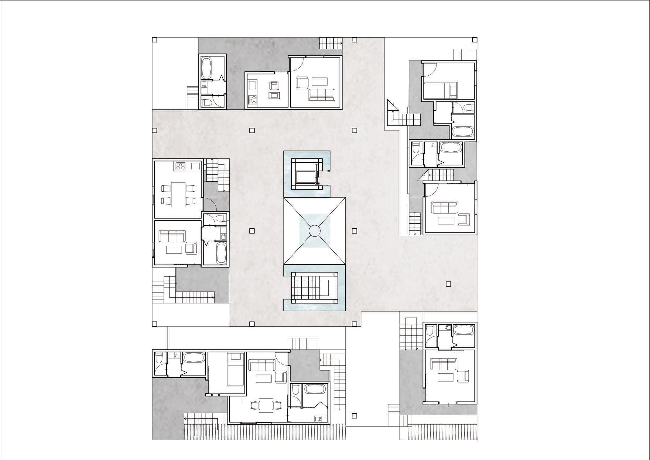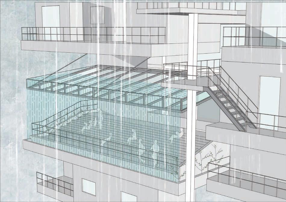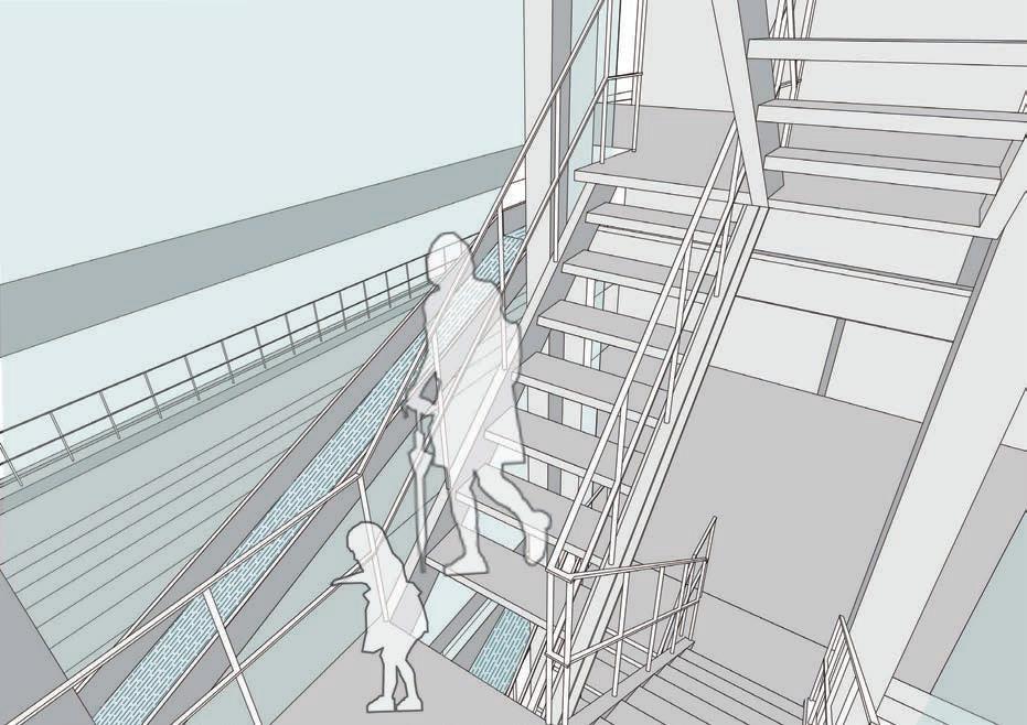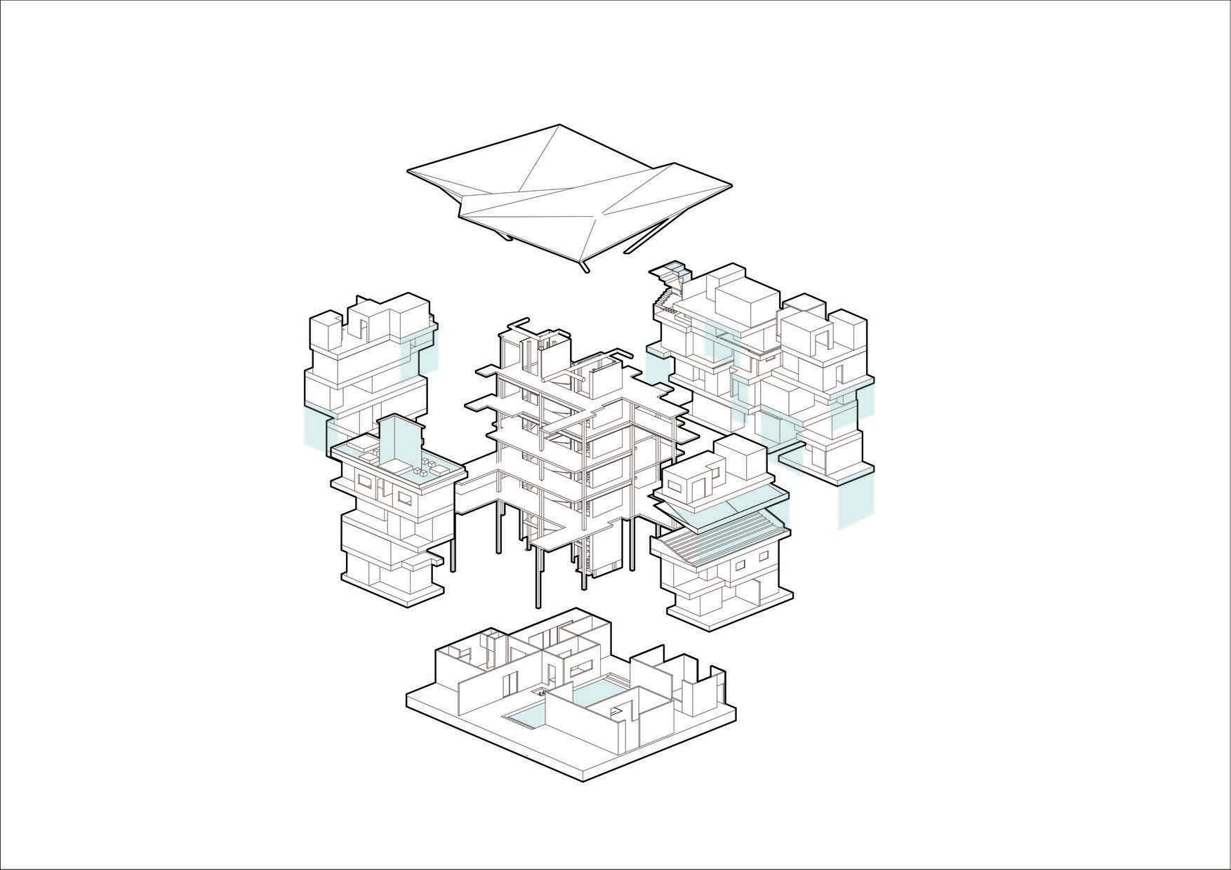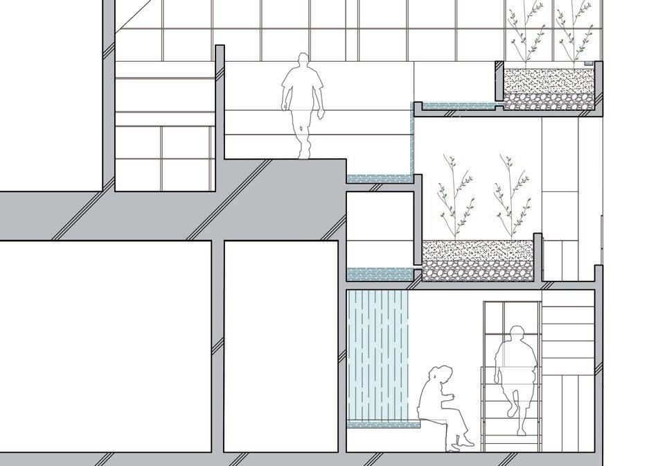 By making the foundations unevenly shaped, the raised foundations serve as furniture, hand washing stations, and stair landings, providing infrastructure that supports not only the building but also the foundation of life.