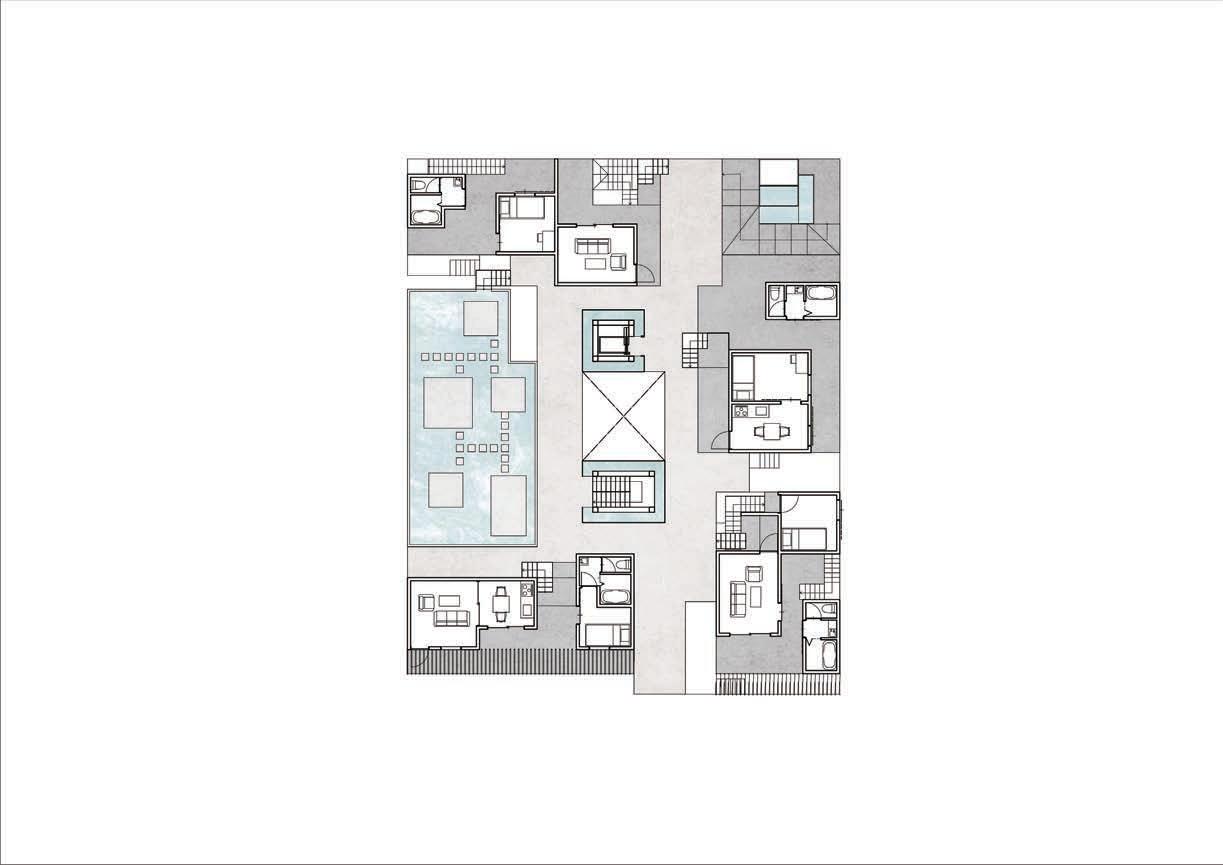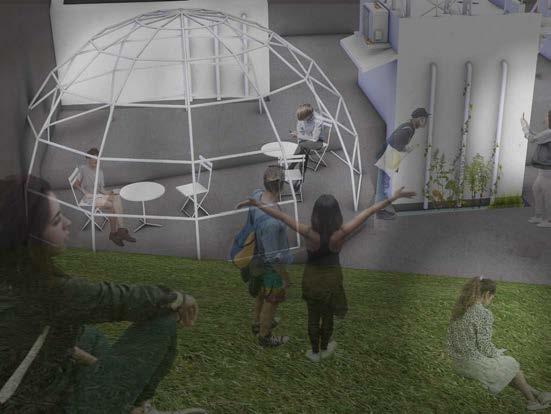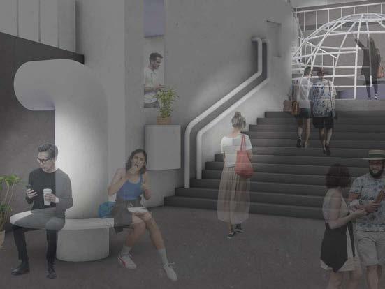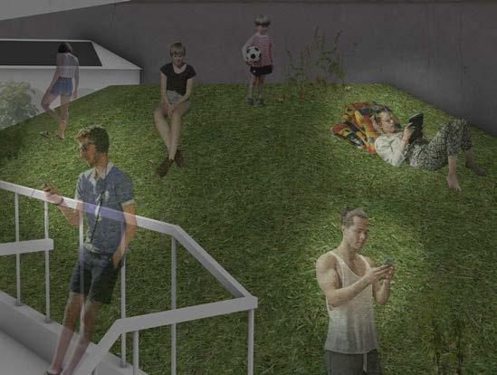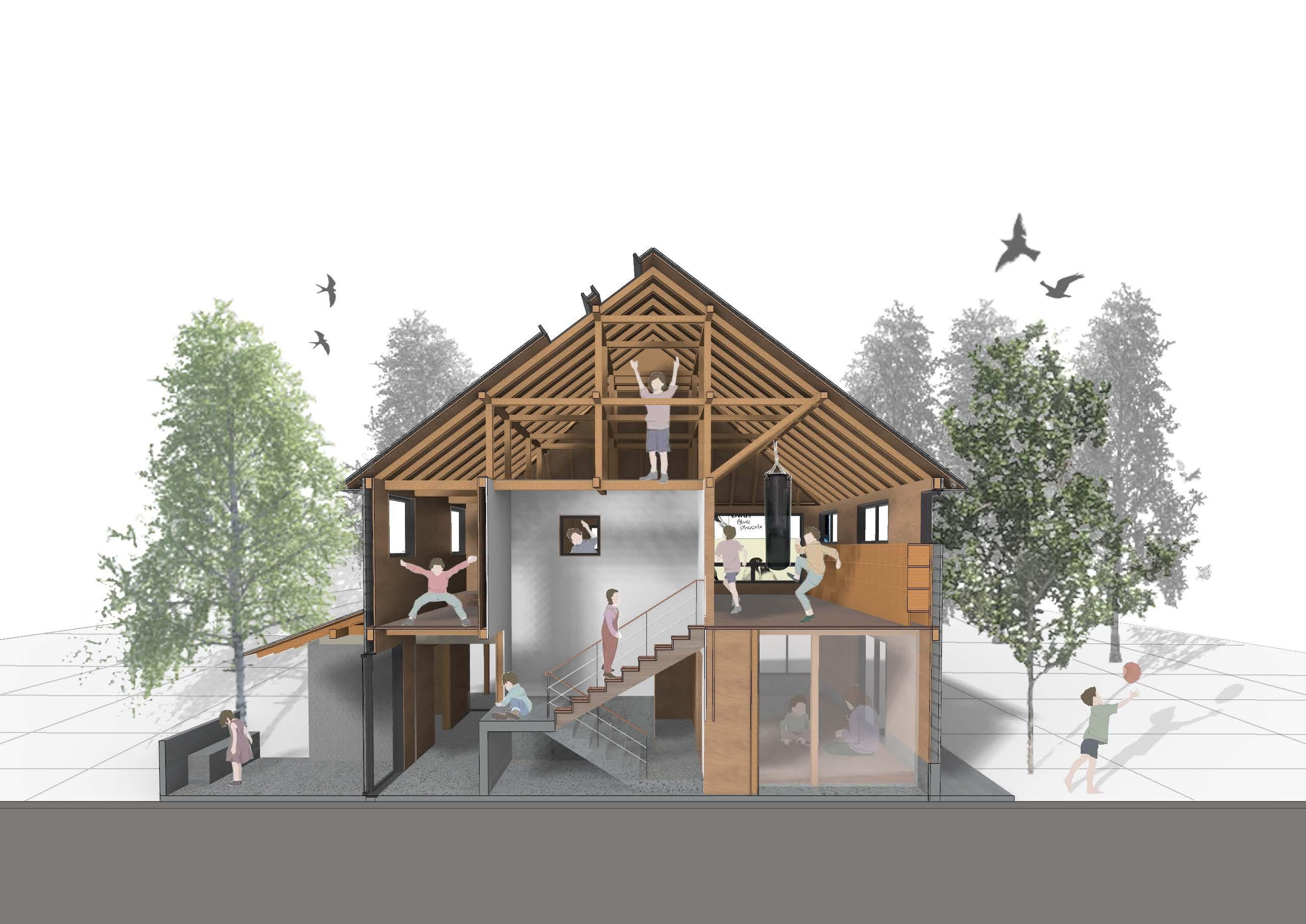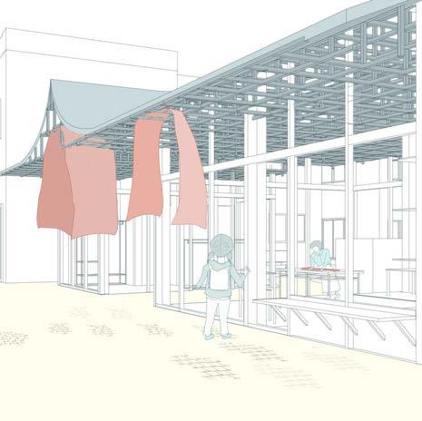 By making the foundations unevenly shaped, the raised foundations serve as furniture, hand washing stations, and stair landings, providing infrastructure that supports not only the building but also the foundation of life.