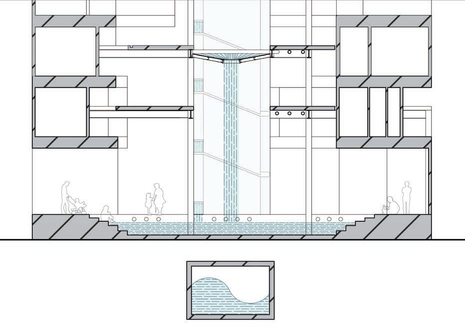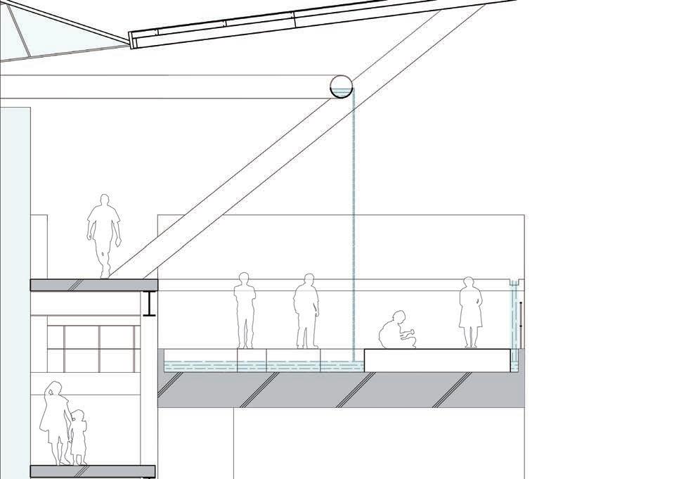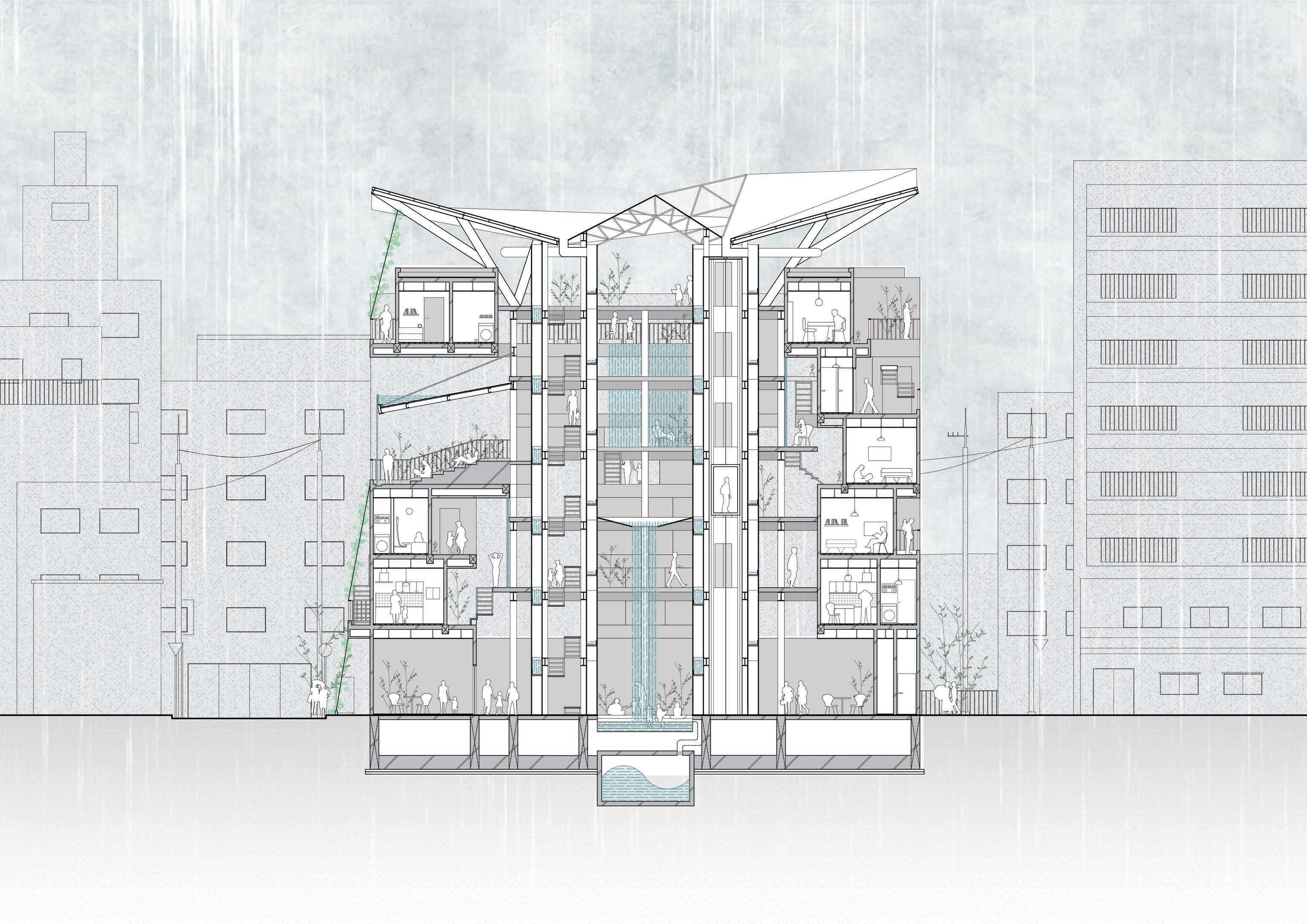 Sumida-ku has long suffered from frequent urban flooding caused by the Sumida River and other factors. Since the 1980s, Sumida has been actively introducing rainwater harvesting as part of its efforts to prevent flooding and make effective use of water resources. However, most of the rainwater harvesting systems in Sumida collect rainwater underground and use it for domestic purposes. Rainwater is the only water resource on earth that is in physical contact with architecture, and I thought that by focusing on its movement and form and incorporating it into architecture, it could be used to enrich people’ s lives.