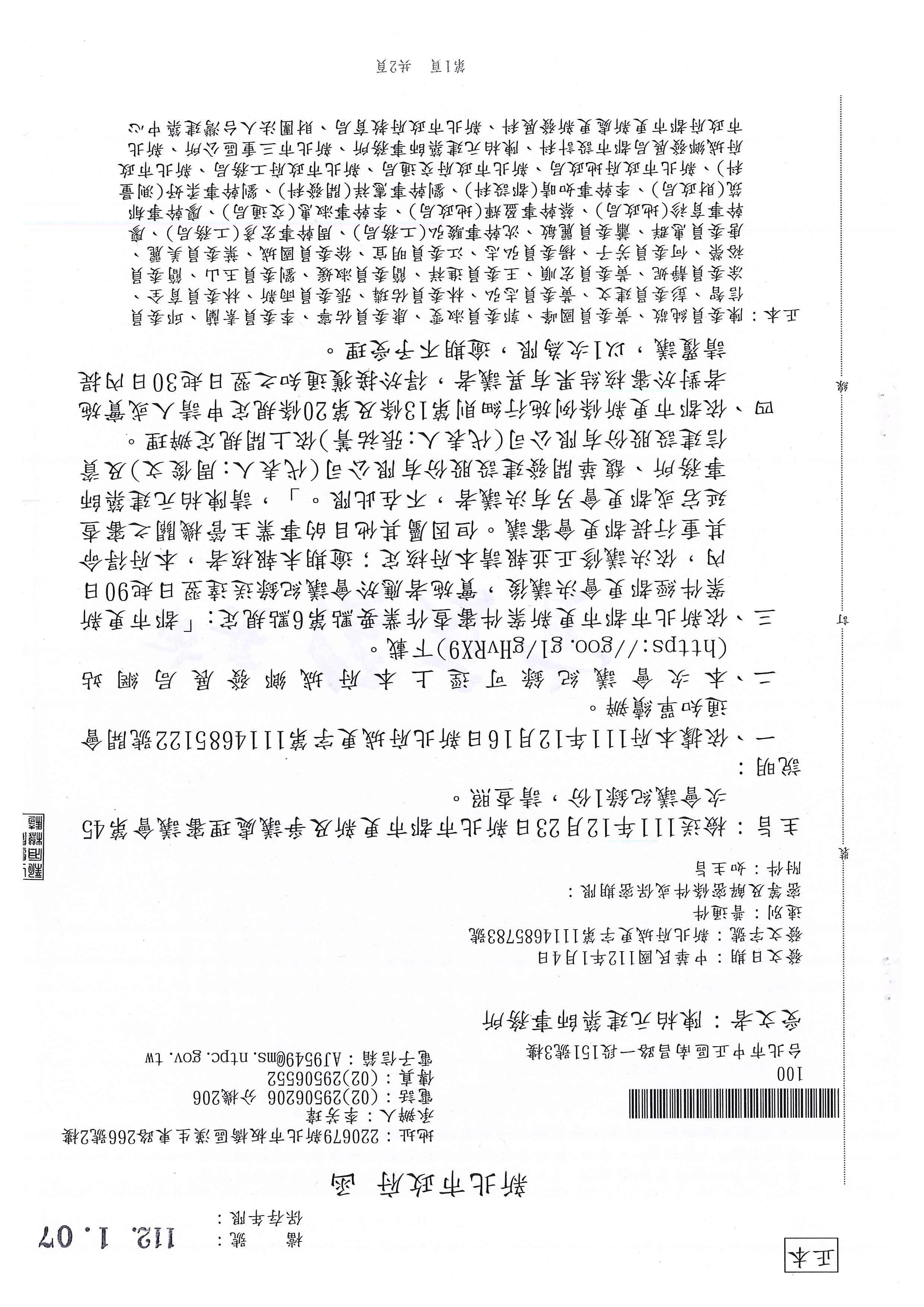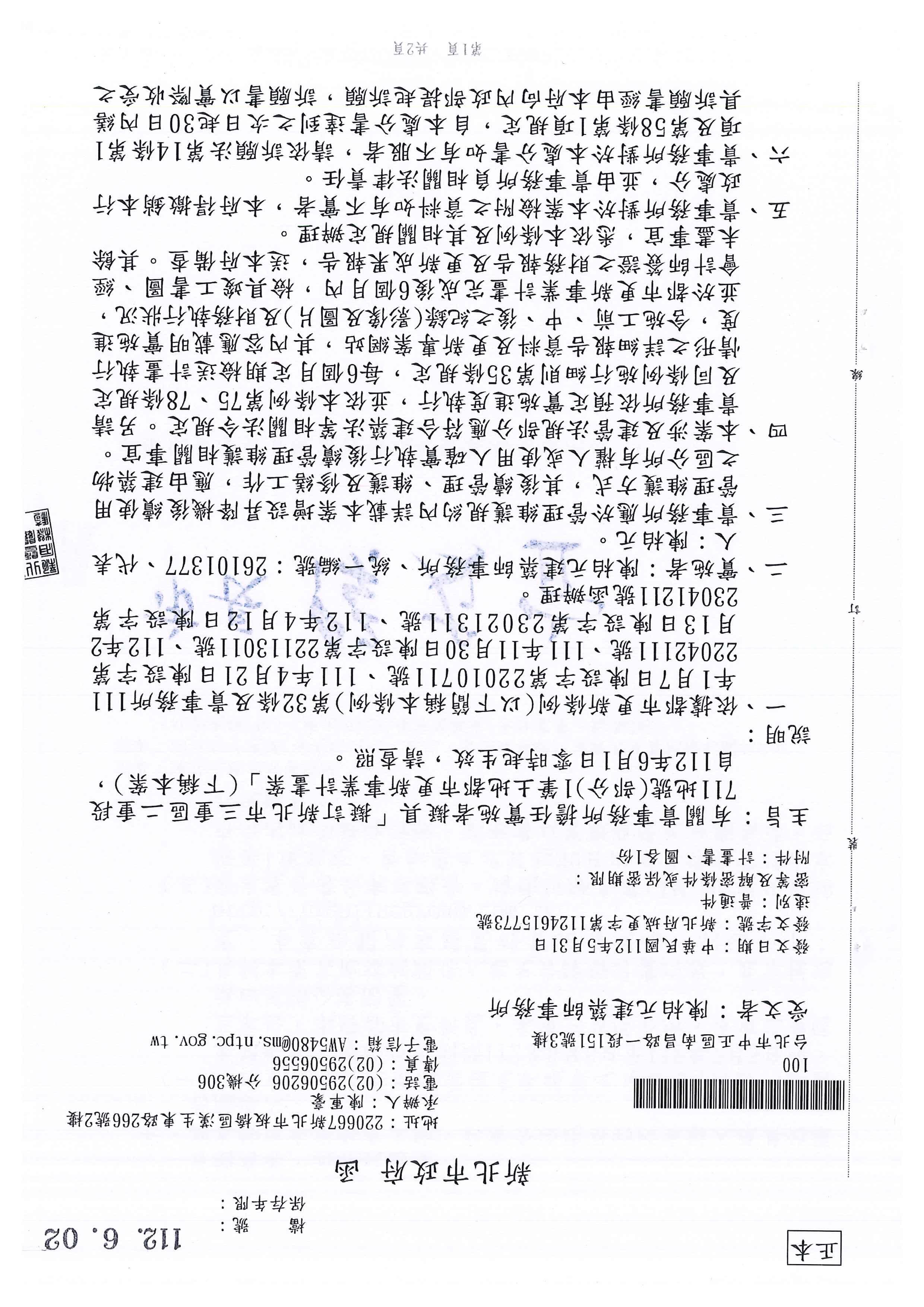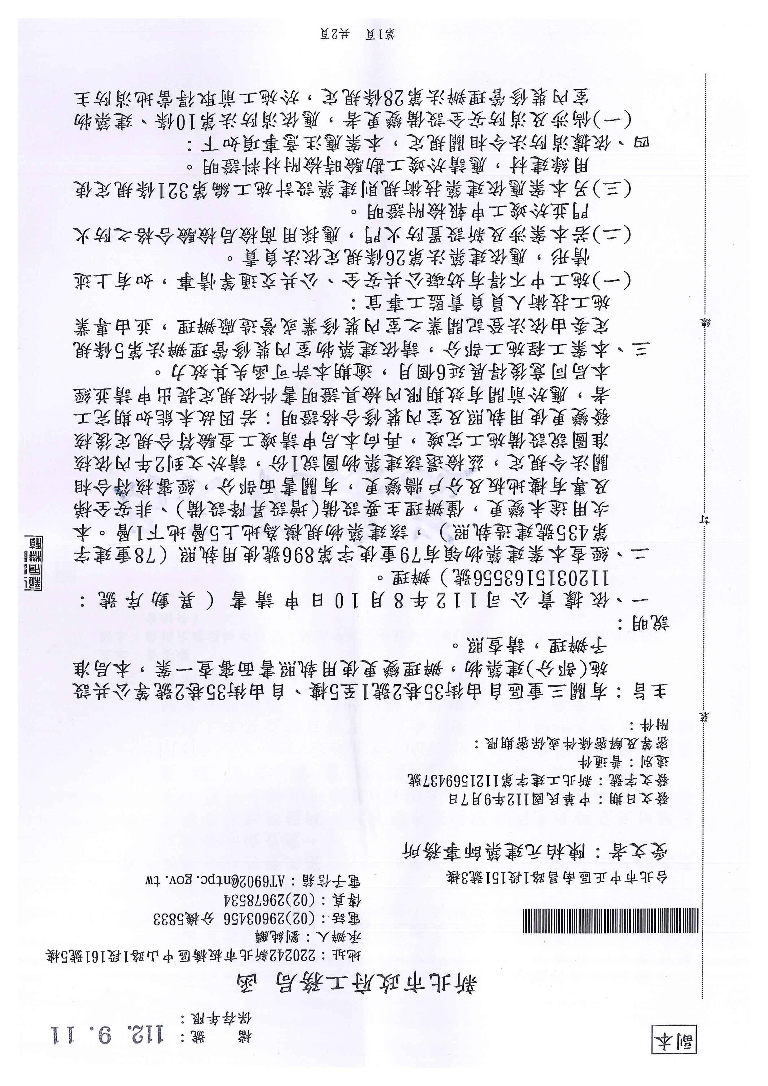 發文字號:新北工建字第1111368059號 速別:普通件