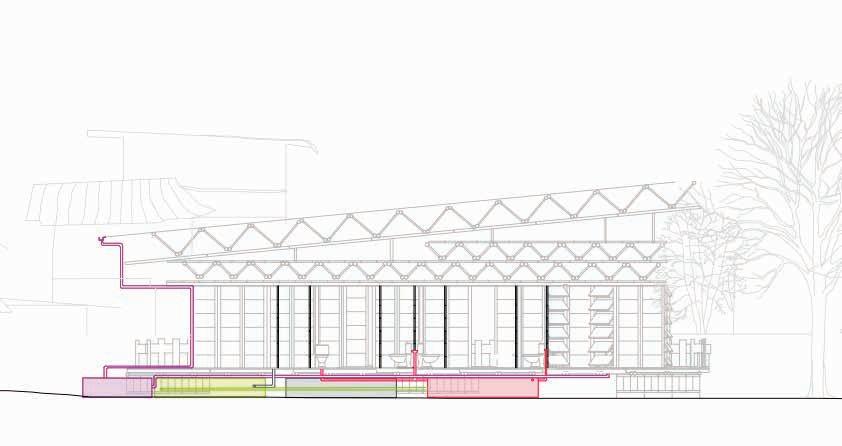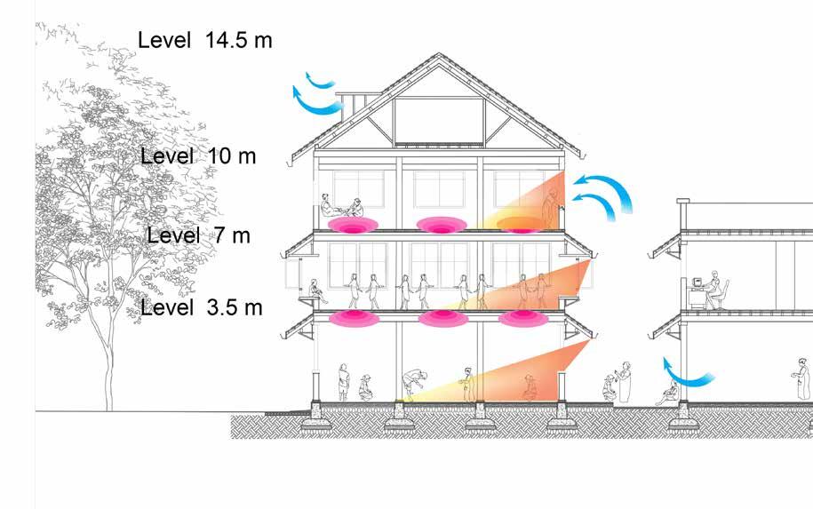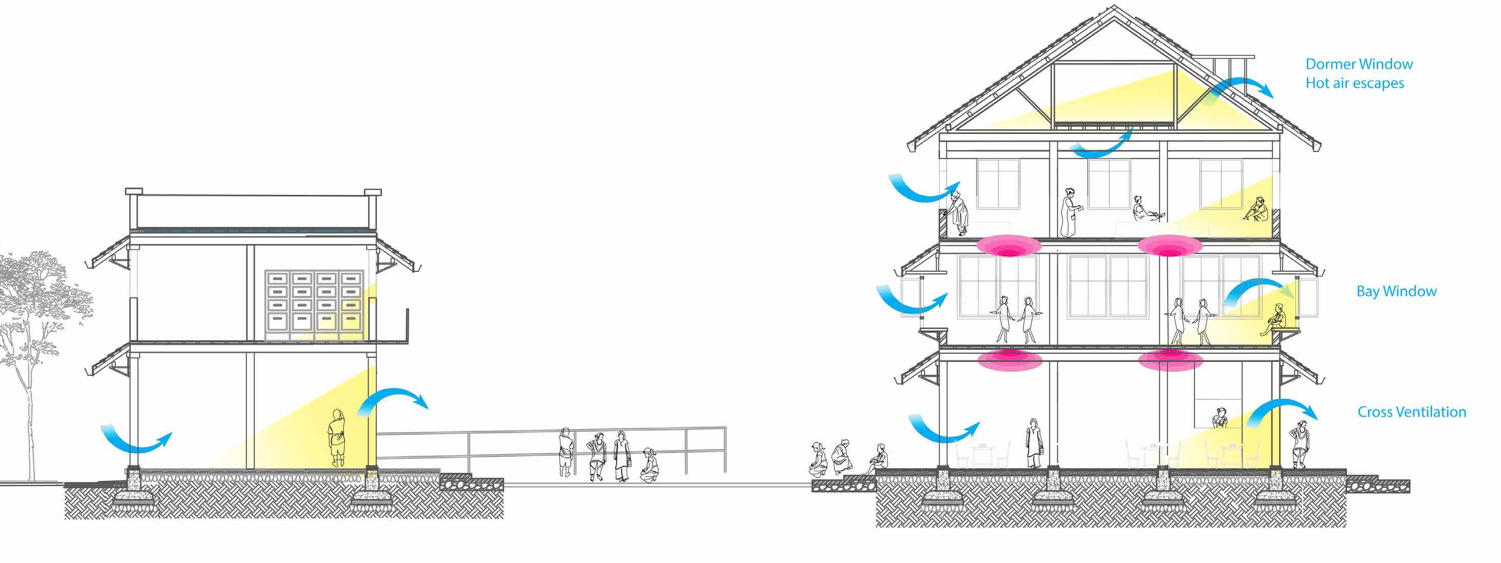 1)To regulate sunlight into spaces, 2)Creating buffer space to avoid direct impact of 3)heat.Rain water harvesting. 4) Treating grey and black water- a source of knowlege and information to visitors. 5)Adding more vegetation - improves natural cooling and shading. Roads surrounding the site allows people to take a pause and have a interaction addition of acoustic panels in between the slab and walls, prevents the roadside chaos of traffics and Dormershops.windows facing towards east helps in escaping hot airs outside.