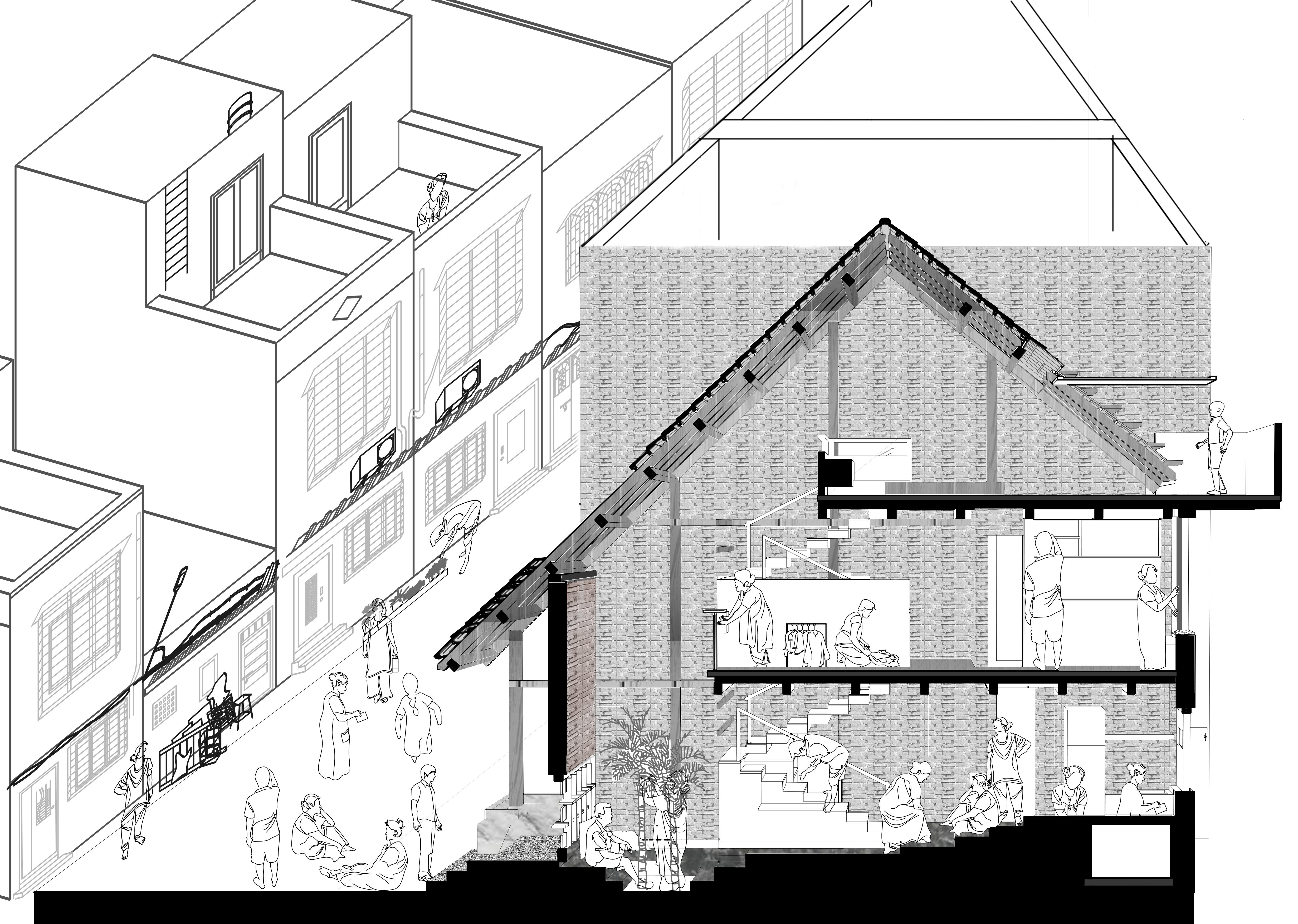 The house which constantly shifts it’s behaviour, where the staircase becomes the core for the multiplicity of activities to happen. the process started with understanding the individual rooms how it behaves like the kitchen as a meeting place for ladies. Bedroom as an irrational dream of space, all the places were stitched together. A porch at the ground floor affords neighborhood interaction. The kitchen with gradual steps for ladies to have a social space while cooking. The steps turned into a drawer for storing of ingredient. The idea of the kitchen as a social space gets fluid and flows out. The staircase becomes a rack to store daily objects required. A wall which folds out to form a storage within a wall, along with the sloping roof at the top turned to be accessible for sitting so as to experience and make irrational dreams of space in real,the presence of glass Mangalore tiles helps in illuminating the rooms naturally.27
