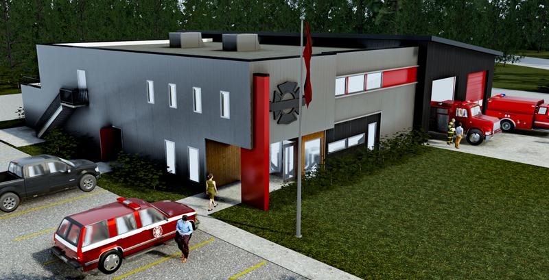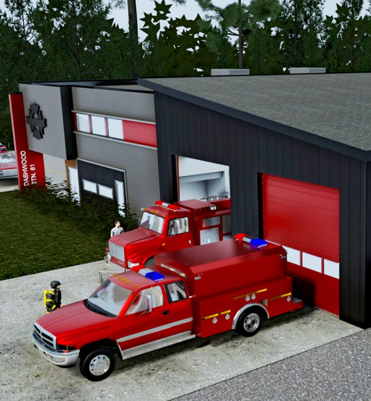 The existing firehall will be demolished and replaced with a new 11,270 SF building in approximately the same location. The new firehall will include prefabricated engineered steel frame construction to post-disaster requirements and includes improved spaces for training and equipment. It will also provide improved indoor air quality with negative pressure ventilation and separation of smoke contaminated surfaces for volunteers’ health and safety. The new firehall is designed to provide future energy savings opportunities with capabilities to add a solar array, water and heat recovery systems, and an EV charging station.