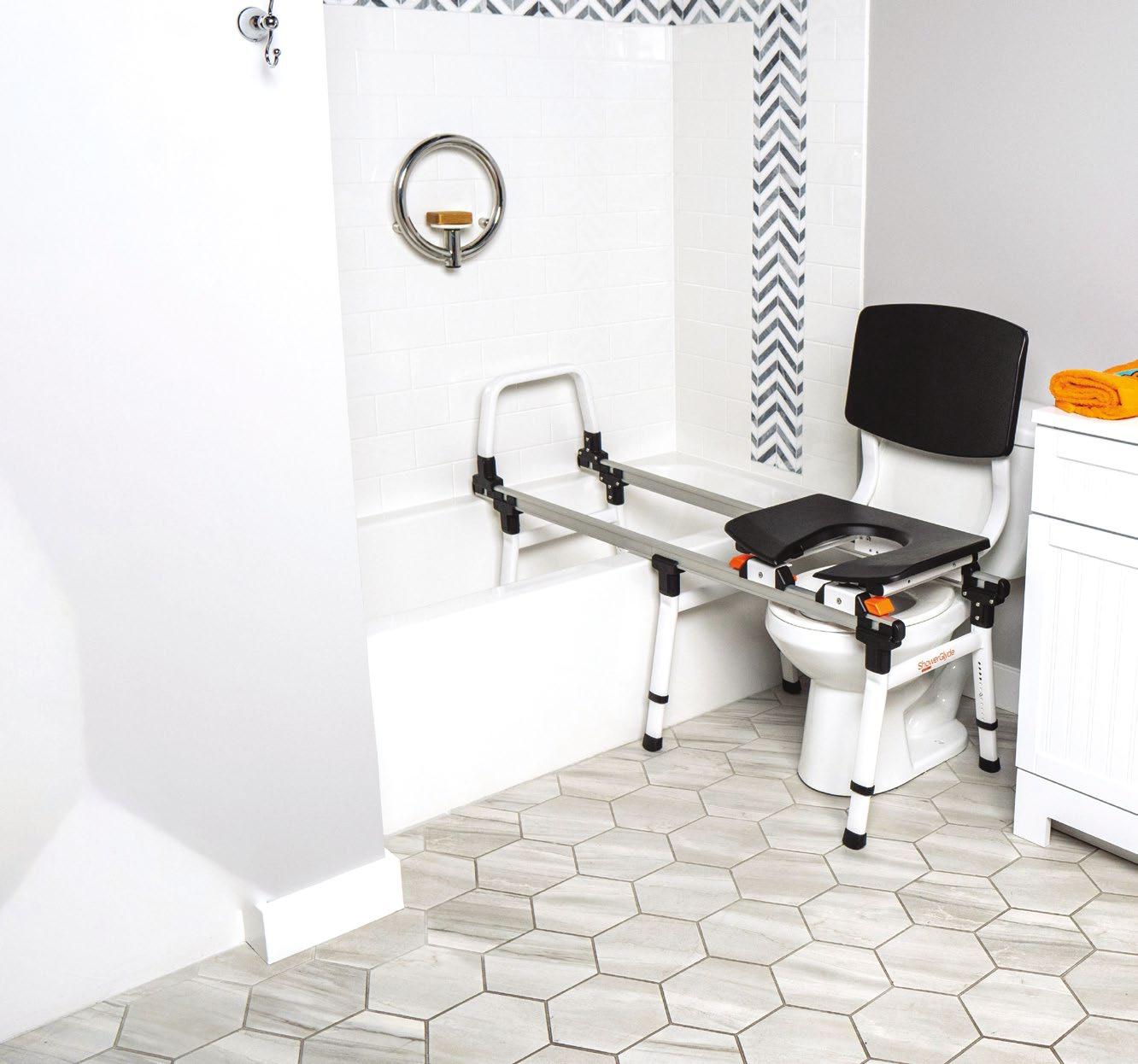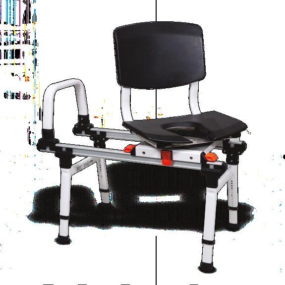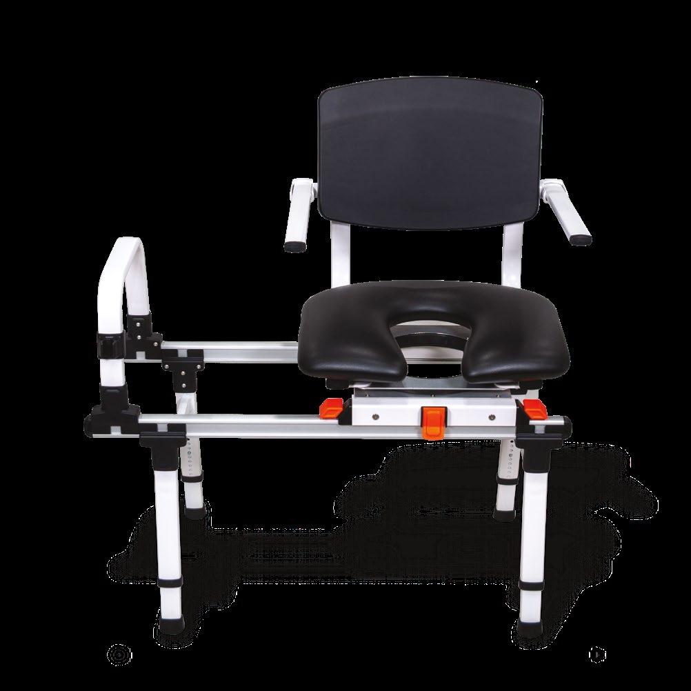 ShowerGlyde Model SG1 is a revolutionary sliding transfer bench. It is designed to fit in environments where there are no obstructions adjacent to the tub (i.e. vanity, toilet). SG1 slides easily over the tub and locks in two points; on the inside and outside of the tub. This allows for safe transfers while using the bench. SG1 can be assembled as a left or right-hand unit. One grab bar installed at the wall side of the rails is included as an aid for sliding. The user can pull or push themselves easily along the rails. SG1 is height adjustable permitting clearance of up to a 19.5" tub height. Optional extension legs are available for taller tubs (up to 25" high). Model SG1 also includes a Seat Belt, a Grab Bar, and a Commode Seat with 3 options; an open Commode Seat for easy washing, a Reducer Ring to reduce the size of the commode opening, and a Solid Seat Insert to close the commode opening completely. Weight capacity is 330lbs.