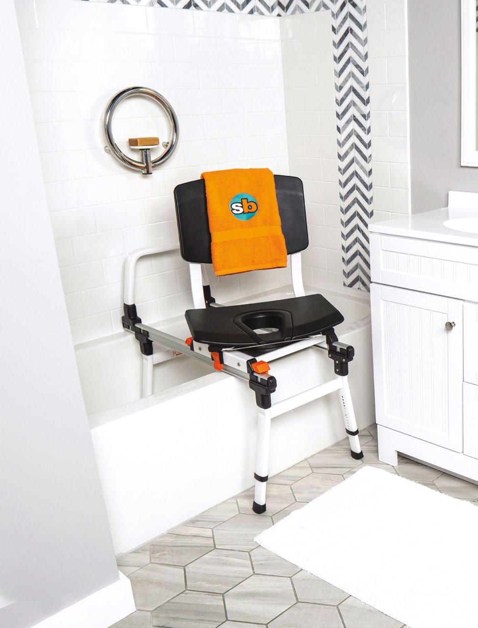 ShowerGlyde Model SG3 is a sliding transfer bench designed to fit in tighter environments or bathrooms with a vanity adjacent to the tub. Shorter rails and a swivel option aIlow the bench to clear the obstruction/tight space without sacrificing comfort or ease of use. SG3 slides easily in and out of the tub and locks in two points; on the inside and outside of the tub. SG3 can be assembled as a left or right-hand unit. One grab bar installed at the wall side of the rails is included for support in sliding. SG3 is height adjustable allowing clearance of up to a 19.5" tub height. Optional extension legs are available for taller tubs (up to 25" high). Model SG3 also includes a Seat Belt, Grab Bar, and a Commode Seat with 3 options; an open Commode Seat for easy washing, a Splatter Guard, and a Solid Seat Insert to close the commode opening completely. Weight capacity is 330lbs.