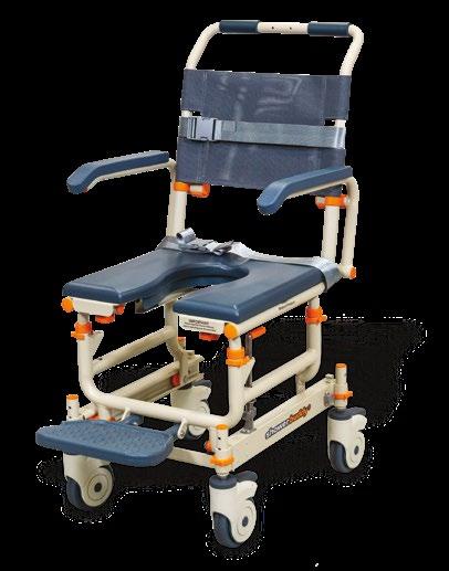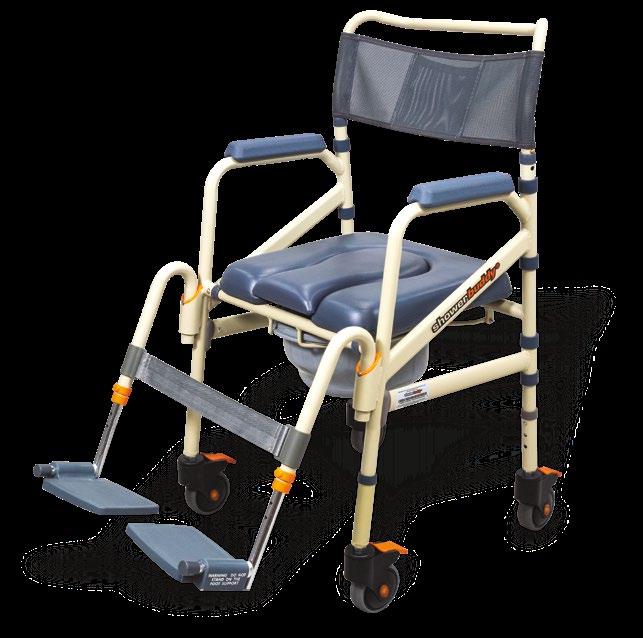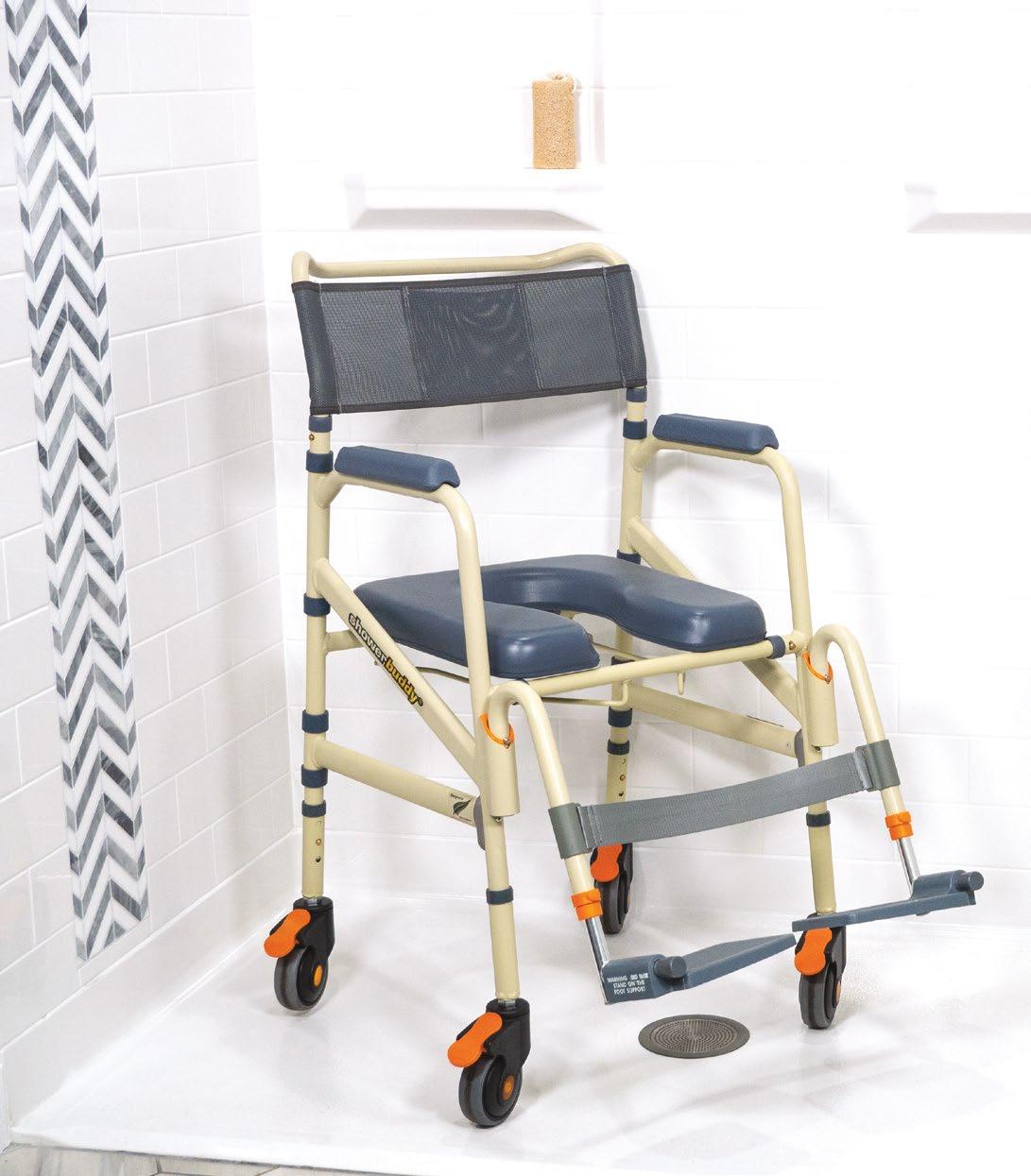 The Roll-InBuddy Solo (SB6W) shower chair is designed for use in a curbless/accessible or roll-in shower stall. The SB6W can roll over most toilets to be used as an overtoilet commode and can double as a bedside commode. It is a self-propelled shower chair and is designed for independent use. The SB6W includes two 24" large, selfpropelled wheels to allow the user independent, safe, and easy maneuvering throughout their home and bathroom area. The chair is equipped standard with a front opening cushion, swing away and removable footrests, a clip-on calf strap, flip back armrests (not lockable), a commode bucket with lid, pee guard, safety belt, and is height adjustable.