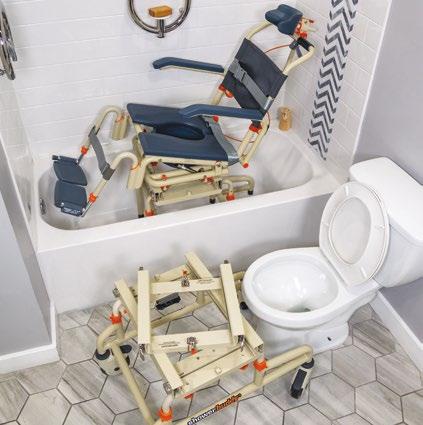 The TubBuddy (SB2) transfer system will transform your existing bathtub or curbed shower into an accessible, barrier-free shower in minutes. It allows the user to enjoy showering again without the high cost, delay, and stress of a full bathroom remodel. The SB2 alleviates heavy lifting and multiple transfers. This chair is separated into three sections: rolling base (shower chair), bridge, and tub base. The rolling base can double as a bedside commode. It also rolls around the house like a wheelchair, allowing users to transfer comfortably and roll over most toilets to be used as an over-toilet commode. When toileting is complete, the rolling base and tub base are connected using the bridge, allowing the unit to slide over the tub lip or curbed shower. Once over the tub/shower, the rolling base and bridge can be disconnected and removed so that the shower curtain can either be closed or allow the caregiver space to move closer to the patient. A custom bridge may be required if the toilet is too close or too far from the tub. The SB2 features a secondary safety mechanism that prevents the chair from rolling off the tracks and causing injury. The SB2 chair comes equipped with a standard front-opening cushion, footrests, flip-back, lockable and removable armrests, 5" lockable casters, a removable commode bucket with lid, chest belt, lap belt, and height adjustability. The TubBuddy (SB2) is a caregiver-assisted product; it is not intended for independent use.