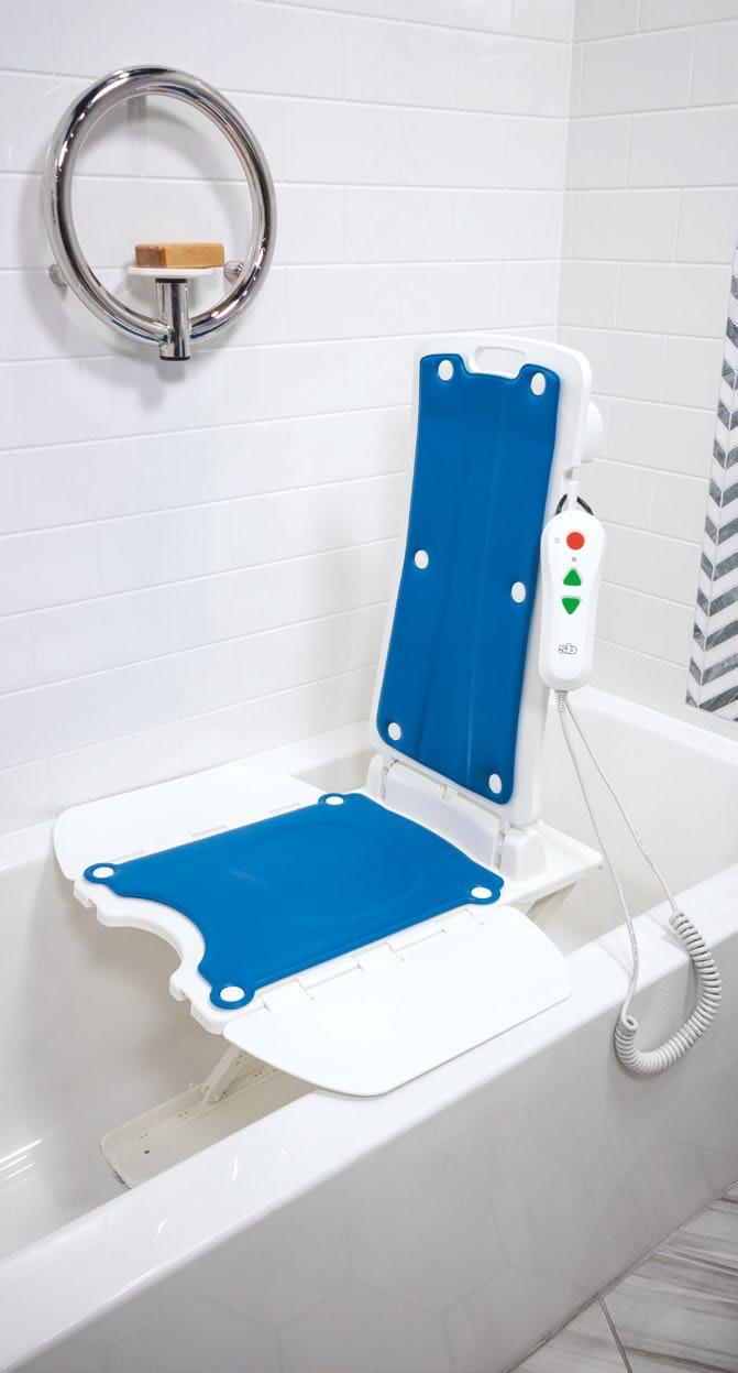 The BathLyft is a battery-operated bath chair that lowers and lifts the user in and out of the bathtub, reducing the strain on the user and preventing the risk of slip and falls. The stable frame and base plate ensure the user’s stability and safety, while the padding and optimized dimensions ensure a comfortable bathing experience. The Bathlyft’s superior design allows for a backrest recline of up to 52° and lowers into the tub with a minimum sitting position of 2.5" from the bottom. The side flaps move into and out of place to create a transfer surface, allowing the user even more peace of mind. The water-tight hand control will provide the user with approximately 35 lifts on a single charge. The built-in safety switch will prevent use if the battery is too low to perform a complete lift. The two-piece construction makes this lift easy to assemble, disassemble, store, and transport. Assembly is tool-free and ensures easy installation and operation. Available in Blue, Orange, Pink, and White.