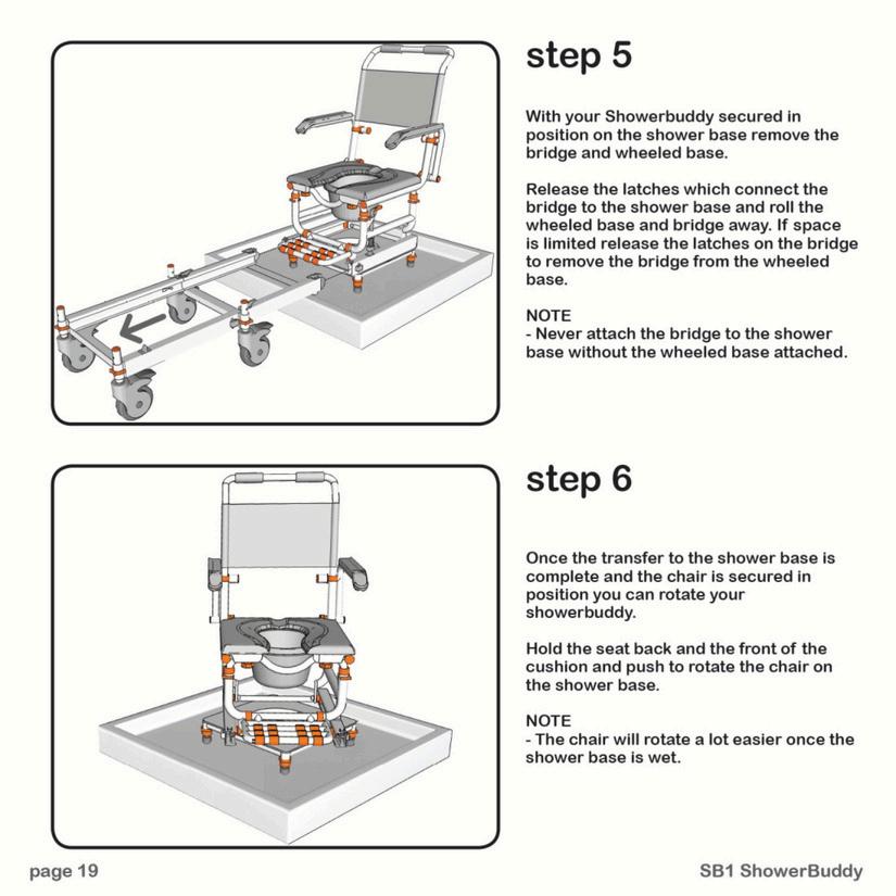 Transfers to and from the Showerbuddy shower chair can be dangerous. Consult a physical or occu pational therapist to ensure safe and reliable transfer techniques are practiced. Individuals who have not learned these skills must have assistance during transfers