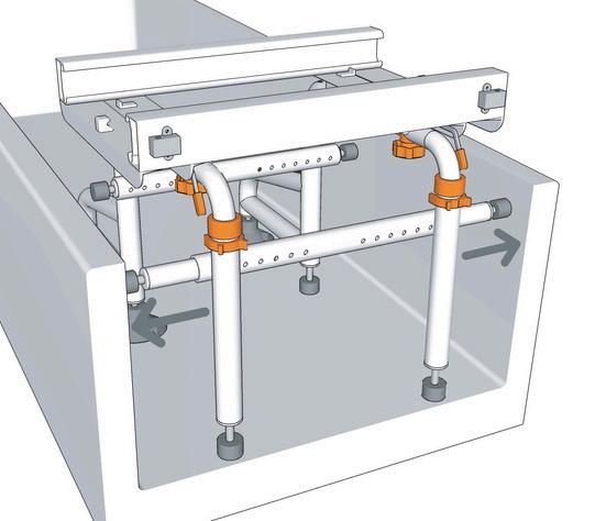 Using the grooves on the underside of the bath base track as a guide, place the bath base track onto the height adjustment tubes. They can only be fitted when aligned correctly. Do not remove the bolt that must go into one of the holes in the tube. Once positioned screw in the thumb knob / screws and plastic half moon washers.