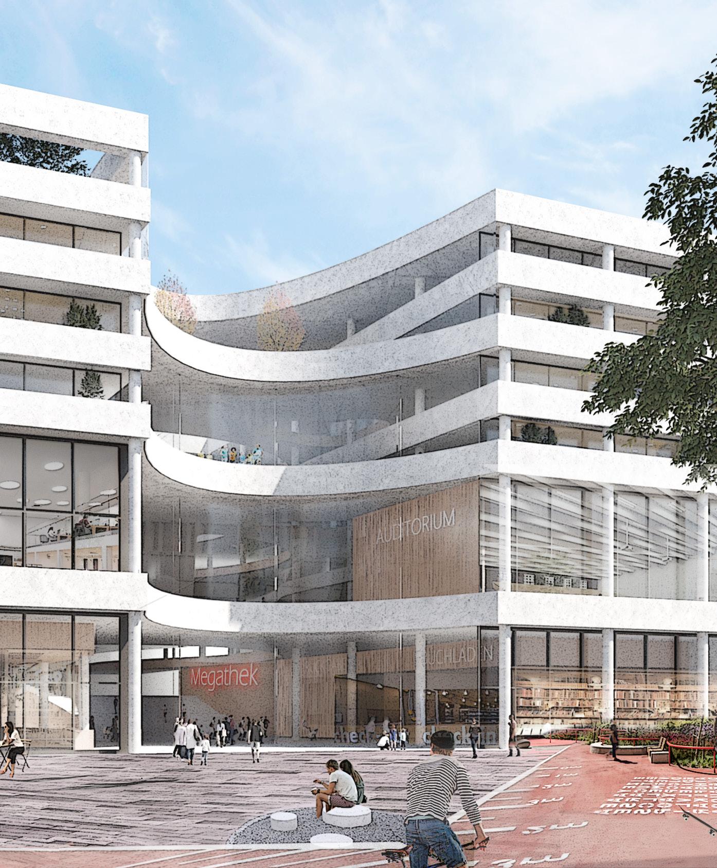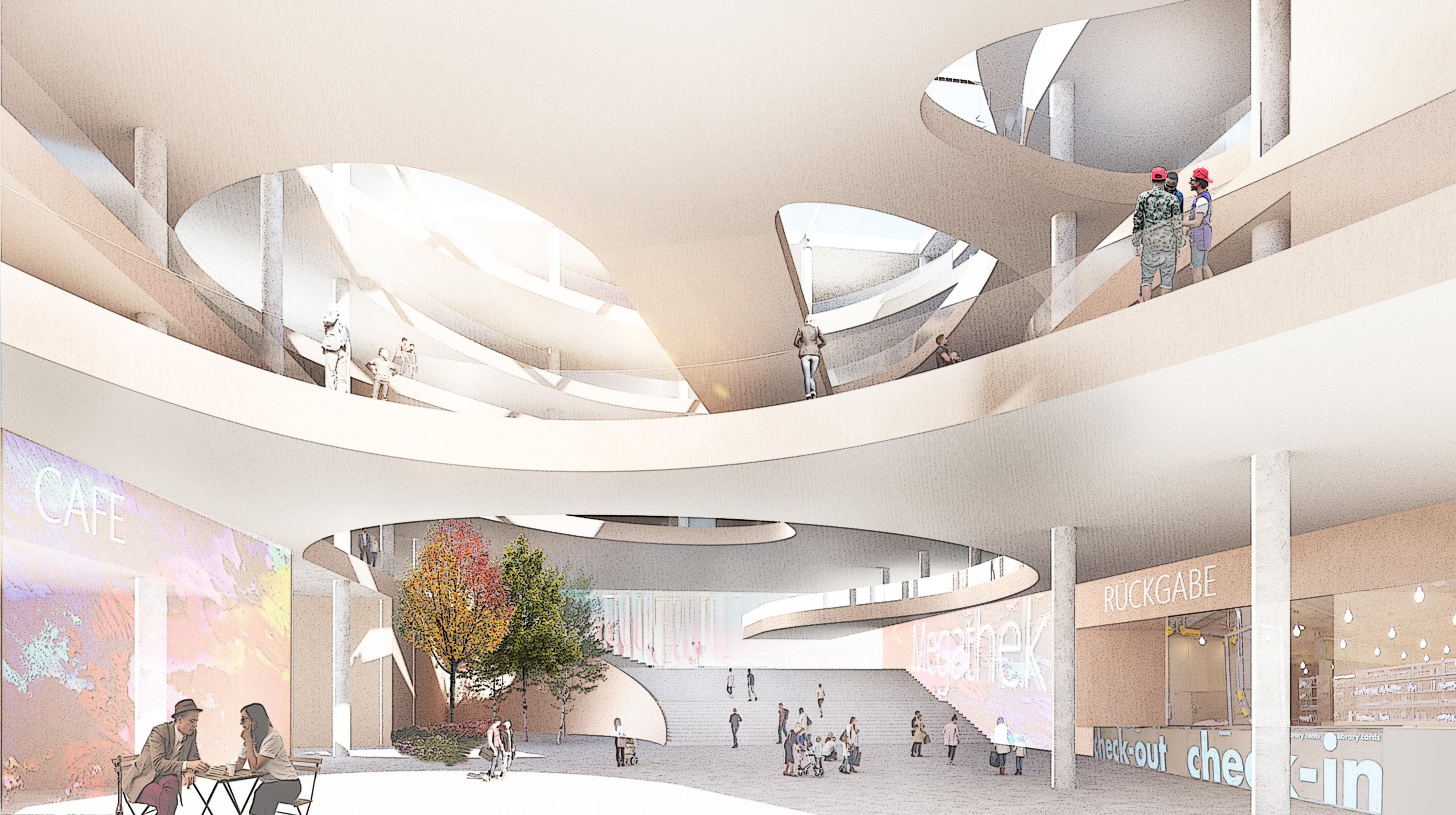 The main design idea for the Megathek Ham burg was to create a space that functions as part if an urban network within itself, support ing the context and their relationships as a public building, providing a range of function for the society to stay, learn , study, work and meet as a landmark in Hamburg city centre.