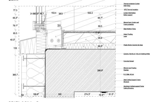 By aesthetic concepts the Materials of the fa cade will be ceramic tiles or marble in the col umns and slabs finishings, the walls will have a mirror effect to reflect the palaces and create the transparent effect, the building will be also cover by a shade facade structure made by plastic wood with iron core.